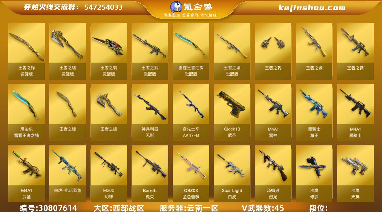 西部战区(云南一区)传说【传说影煞】45v【M200-幻神,武圣套,动感闪耀套,QBZ-金色蔷薇,ScarLight-白虎,白虎-电玩蓝兔,荣耀世冠-火麒麟,柯尔特-竞技荣光,qbz03-吕布,金刚伞-电玩红兔】8王者【王者之城,王者之戮,雷霆王者之锋,王者之刺,王者之锋,王者之啸】5角色【传说影煞,四防王者玲珑-小乔,电竞教官-云悠悠,修道士,乔伊教练,职业选手】1音效【M4A1-雷神音效】23皮【毁灭-魔灵,毁灭-风暴,毁灭-CFS2020,黑骑士-破浪10年,雷神-宇航兔,雷神-星空,黑骑士-地狱火,雷神-维纳斯,火麒麟-雷神,火麒麟-CFSTAR,天龙-CFSTAR,修罗-CFSTAR,火麒麟-平天大圣】挑战枪【爆炎激光-超越MAX,试炼破坏者III,机甲撕裂者III,VEPR-12-金魔,KAC-圣炎切割者III】截图展示段位不代表实际段位,如赛季更新等不可抗拒因素发生变化、时限道具不保证所剩时间