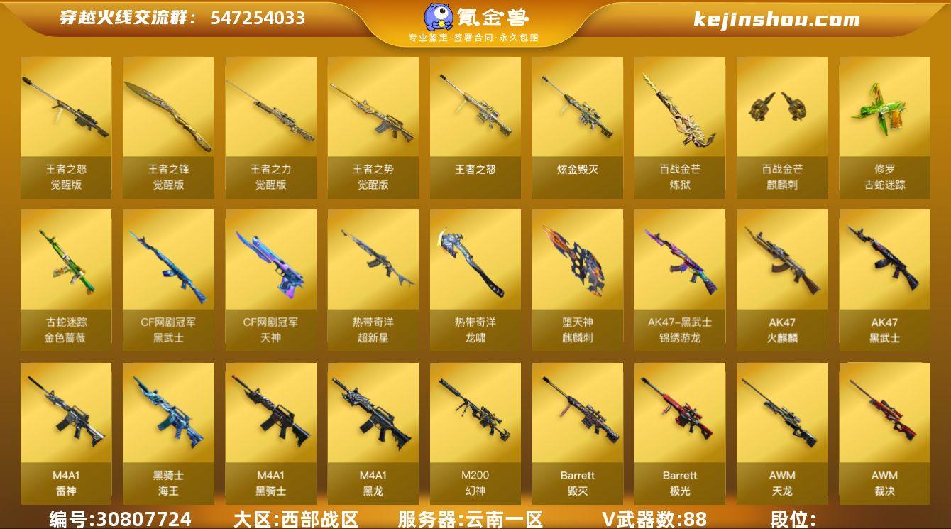 西部战区(云南一区)ys【精美爆破生化号】88v【M200-幻神+双皮/N9-2020MVP/黄忠,Kar98k-星神套+皮/巅峰荣耀,竞技荣光套装,古蛇迷踪套装,热带奇洋套装,ScarLight-白虎+音效卡,QBZ03-金色蔷薇,AWM-裁决+皮/叶芒苍灵,HK417-朱雀,荣耀世冠-雷神,6烈龙+斯泰尔-蝴蝶,USP-雷暴*2,荣耀世冠-柯尔特,Colt1911-大黄蜂,猫猫手套,金刚伞-电玩红兔】5王者【王者之势,王者之力,王者之怒,王者之锋】1炫金【炫金毁灭】7角色【四防王者魅影,四防王者-葵-貂蝉,电竞教官-云悠悠,审判者,奇洋探员,蛇隐宗,葵-阿尔法武装】8音效【Kar98k-星神音效卡,ScarLight-白虎音效卡,AK47-火麒麟音效卡,M4A1-黑龙音效卡,M4A1-黑骑士音效卡,Barrett-毁灭音效卡,M4A1-雷神音效卡,炼狱-百战金芒-庆典舞曲音效卡】 37皮【幻神-N9-2022MVP,幻神-黄忠,星神-巅峰荣耀,裁决-叶芒苍灵,雷神-宇航兔,屠龙-荣耀世冠AG,黑龙-冠军之武,火麒麟-荣耀世冠AG,AK47-火麒麟-传奇EVEN,毁灭-星空,麒麟刺-萌杀,火麒麟-心动糖果,毁灭-SV-CFPLS16冠军,火麒麟-雷神,雷神-星空,毁灭-荣耀之怒,屠龙-荣耀之锋,雷神-荣耀之魄,AWM-天龙-传奇白鲨,火麒麟-CF STAR,黑龙-墨子,雷神-虎将,M4A1-千变-孔明,AWM-天龙-传奇70KG】小人物枪【HK417-朱雀-蛇隐宗,星神-炽天使,COP-白鲨,斯泰尔-蝴蝶】VIP6截图展示段位不代表实际段位 如赛季更新等不可抗拒因素发生变化、时限道具不保证所剩时间