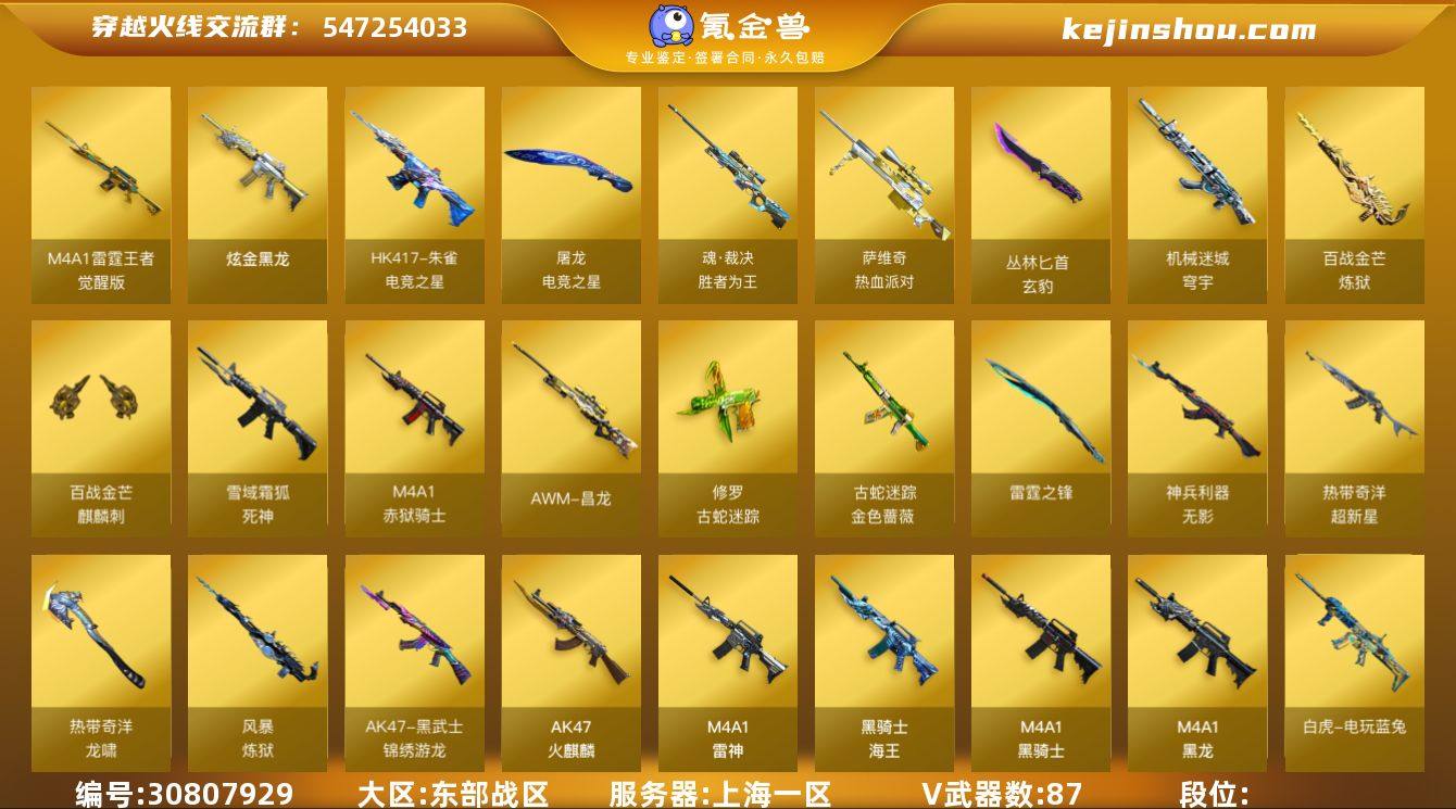 东部战区(上海一区)【生化爆破挑战一体号】【臻选金狐三件套+挑战九阶全满+BOSS卡134】87v【M200-幻神套+四皮/星火小队/CFS2022/动感闪耀/黄忠,荣耀世冠套装,古蛇迷踪套装,热带奇洋套装,电竞之星套装,QZB03-金色蔷薇+双皮/皮破浪逐光/CFS2024,白虎-电玩蓝兔,AWM-裁决+三皮/胜者为王/叶芒苍灵/运输船,HK417-朱雀-电竞之星+音效卡,M4A1-雷霆王者,6烈龙+斯泰尔-蝴蝶+MAC-10-千针棘鲨+MAC-10-远古神话,柯尔特-电竞之星,USP-雷暴,柯尔特-竞技荣光,荣耀世冠-柯尔特,丛林匕首-玄豹,QBZ03-街机-飒爽刀锋,金刚伞-电玩红兔,Colt1911-大黄蜂,猫猫手套】2王者【M4A1-雷霆王者】1炫金【炫金黑龙】14角色【四防雨棠(全生化带生化背包变更),四防王者葵-惊若翩鸿,四防王者玲珑-小乔,零-纪元,战地猎狐,堕落女神,幻面灵狐,葵-阿尔法武装,奇洋探员,乔伊教练,蛇隐宗,修道士,雪域霜狐,云海玲珑,四防超能女侍-觉(全生化带生化背包变更)】9音效【M200-幻神音效卡,炼狱-百战金芒-庆典舞曲音效卡,Barrett-碧霄极光音效卡,AWM-昌龙-怀旧音效卡,M4A1-黑骑士音效卡,HK417-朱雀-电竞之星-竞星悦动音效卡,死神-雪域霜狐-怀旧音效卡,屠龙-电竞之星-竞星悦动音效卡】53皮【幻神-星火小队,幻神-CFS2022,幻神-动感闪耀,幻神-黄忠,金色蔷薇-破浪逐光,金色蔷薇-CFS2024,朱雀-武当,雷神-极氪汽车,黑骑士-少林,毁灭-魔灵,雷神-春花弄影,裁决-胜者为王,裁决-叶芒苍灵,裁决-运输船,龙啸-蛇姬,白虎-热带奇洋,雷神-宇航兔,雷神-荣耀世冠AG,雷神-R.LGD-CFPLS18冠军,屠龙-破浪逐光,炼狱-电子连击,毁灭-风暴,白虎-巅峰荣耀,星神-巅峰荣耀,屠龙-荣耀世冠AG,毁灭-百城浙江,黑骑士-破界,毁灭-虹光风暴,雷神-化蛇,毁灭-秦师,炼狱-玩具枪,白虎-暗星,火麒麟-CF STAR,黑龙-墨子,火麒...