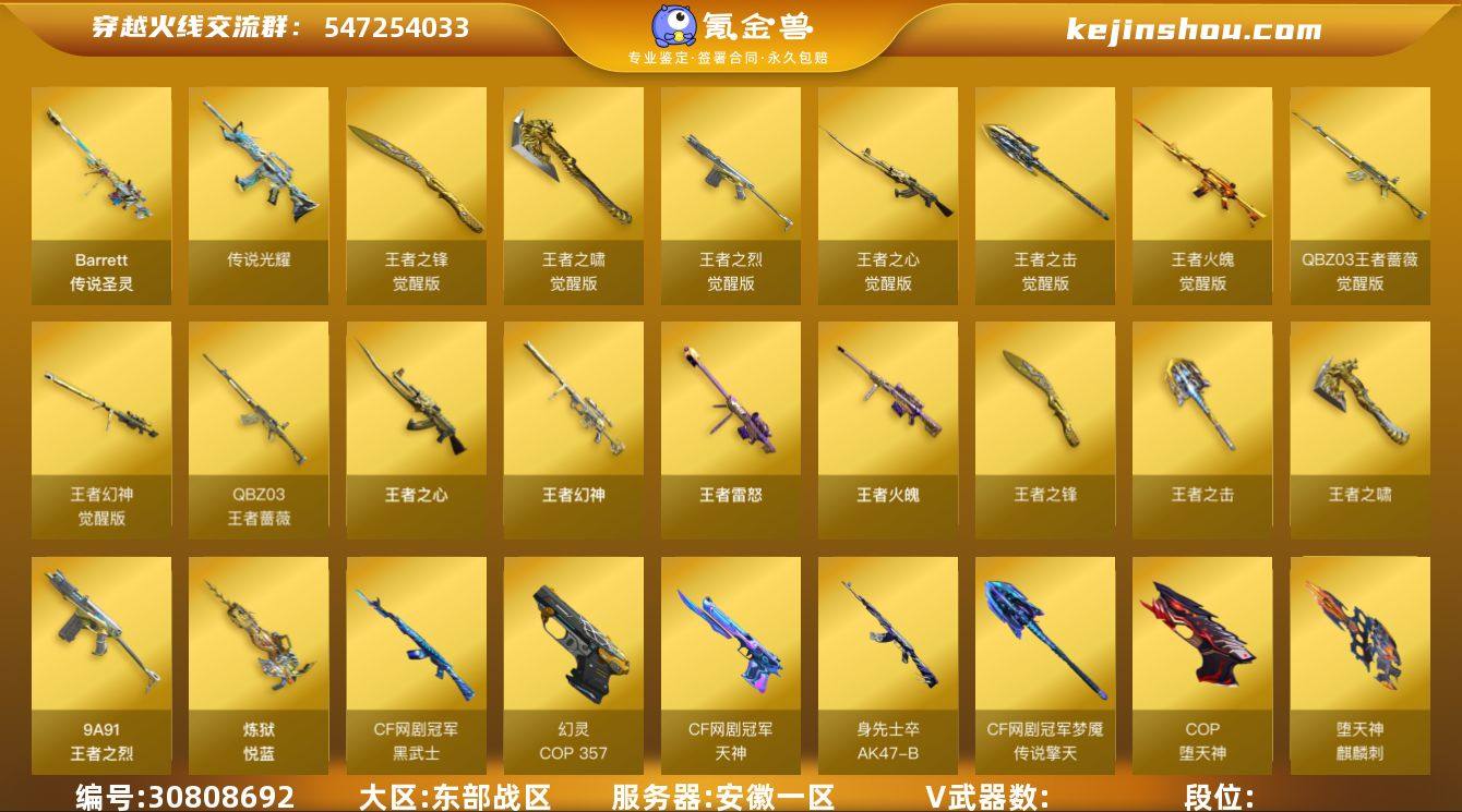 L626805 【传说光耀(2537序列号)/传说圣灵/幻神三件套(音效卡+冠军之幻+AGS17+周瑜)/裁决/白虎/王者幻神/王者蔷薇/蝴蝶+烈龙*6/盘龙*6+炼狱/COP幻灵*2/COP堕天神*2/四防影豹+王者春+貂蝉+春雅灵花+职业经理/音效卡+毁灭+火麒麟+极光+黑骑士/皮肤:雷神-R.LGD+杨戬/毁灭-张飞+CFS2020/】 会员等级0 英雄级武器数量132 【可二次实名】 【永久包赔】 【能人脸包赔】 【VIP 0】 【能排位】 【传奇】 稀有套装2 传说武器2 王者炫金武器11 热门武器6 英雄级武器37 稀有武器10 暴走生化4 挑战大师5 角色10 稀有皮肤22 音效卡6 投掷武器8 稀有套装:幻灵套,堕天神套; 传说武器:传说光耀,传说圣灵; 王者炫金武器:闪光弹-雷霆王者,王者雷怒,王者之烈,王者幻神,炼狱-悦蓝,王者之击,王者之心,QBZ-03-王者蔷薇,王者火魄,王者之啸,王者之锋; 热门武器:COP 357-幻灵,Scar Light-白虎,M200-幻神,COP-堕天神,斯泰尔-蝴蝶,金刚伞; 英雄级武器:麒麟刺-百战金芒,无影-神兵利器,AK47-火麒麟,9A-91-烈火,天神-CF网剧冠军,黑武士-CF网剧冠军,擎天-CF网剧冠军,AWM-裁决,沙鹰-修罗,M4A1-幻灵,幻灵之锋,AK47-黑武士,AK47-无影,AK47-黑鲨,M4A1-龙血,M4A1-猎神,RPK-盘龙,汤姆逊-烈龙,加特林-炼狱,M4A1-死神,Barrett-毁灭,AK-47-猩红传说,Barrett-暗月传说,AK47-B-常胜将军,AK47-B-战士,AK47-B-身先士卒,沙鹰-天神,屠龙,Barrett-极光,擎天,M4A1-堕天神,龙啸-堕天神,麒麟刺-堕天神,M4A1-黑龙,M4A1-黑骑士,M4A1-雷神,AWM-天龙; 稀有武器:天龙-曼陀罗,迷你波特博士,迷你白狐,加利尔ACE-零号,迷你裂空之翼,AWM-灵狐-15周年嘉年华,雷神-小红,牛牛-AK47,QBZ03-吕布,巴雷特-零-水下丽影; 暴走生化:轻型军用手斧-镜,女皇终结者-魔龙之吻,6盘龙,6烈龙; 挑战大师:VEPR-...