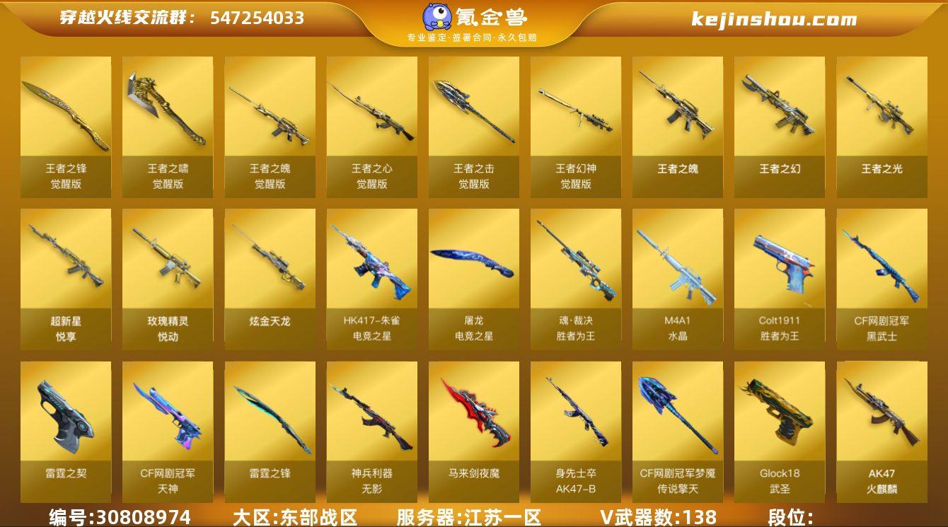 东部战区(江苏一区)ys【爆破生化号】138v【M200-幻神套+双皮/丹凤/AG-CFPLS17冠军,王者幻神,雷暴套装,雷霆套装,武圣套装,CF网剧套装,QBZ03-金色蔷薇+皮/冠军之薇,白虎-电玩蓝兔,HK417-朱雀,AWM-裁决+双皮/流光秘银/羽掣,M4A1-夜魔,6烈龙+5修罗,COP357-雷霆,USP-雷暴,荣耀世冠-柯尔特,柯尔特-竞技荣光,QBZ03-吕布,金刚伞-电玩红兔,Colt1911-大黄蜂】13王者【王者幻神,王者之心,王者之幻,王者之魄,王者之光,王者之锋,王者之击,王者之啸】2炫金【炫金武士,炫金天龙】18角色【四防王者葵,四防王者春,四防王者瞳-闭月羞花,四防王者葵-惊若翩鸿,四防王者玲珑-小乔,王者凌霄,春,葵,零,审判者,炫,魅影,零·纪元,堕落女神,蛇隐宗,幻面灵狐,乔伊教练,云海玲珑,荆棘玫瑰,职业选手】7音效【M200-幻神音效卡,Barrett-毁灭音效卡,M4A1-雷神音效卡,M4A1-黑骑士音效卡,HK417-朱雀-电竞之星-竞星跃动音效卡,屠龙-电竞之星-竞星跃动音效卡,白鲨语音包】98皮【幻神-AG-CFPLS17冠军,幻神-丹凤,雷神-烈虎,雷神-机甲刑天,黑骑士-白马银枪,雷神-脉冲,烈火-熔核,裁决-流光秘银,裁决-羽掣,屠龙-荣耀世冠,毁灭-星空,毁灭-风暴,QBZ03-冠军之薇,雷神-宇航兔,天龙-秘银,黑骑士-冠军之势,火麒麟-心动糖果,烈龙-星空,毁灭-AG-CFPLS15冠军,毁灭-CFS2018,火麒麟-雷神,火麒麟-CFS2018,修罗-星空,雷神-星空,毁灭-CFS2020,天龙-传奇70KG,毁灭-黑大圣,屠龙-荣耀之锋,火麒麟-平天大圣,雷神-白鲨-CFSPLS14冠军,雷神-冠军之魄,黑龙-361,天龙-传奇白鲨,毁灭-荣耀之怒,雷神-荣耀之魄,火麒麟-AG战队,黑武士-典韦】vip6 截图展示段位不代表实际段位 如赛季更新等不可抗拒因素发生变化、时限道具不保证所剩时间