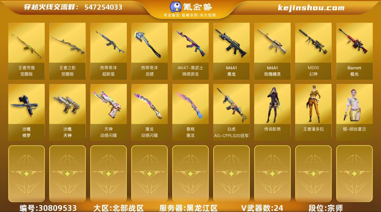 黑龙江区-25V-3王者-0炫金 【传说角色】:传说影煞 【热门武器】:M200-幻神,沙鹰-修罗*3 【音效卡】:AN94-超新星-热带奇洋音效卡 【皮肤】:幻神-动感闪耀 皮肤,白虎-AG-CFPLS20冠军,屠龙-春桃 皮肤 【角色】:王者潘多拉,奇洋探员,乔伊教练,北极狐-X,电竞少女,嘉年华灵狐,0号玩家,潘多拉-甜心教官,潜龙队-X,新娜塔莎,樱-缤纷夏日,影武者-X,游珑儿 【人偶武器】:Scar Light-马枪,AWM-灵狐-15周年嘉年华,灵狐娃娃手雷 【挑战大师】:神圣爆裂者-末日III 【英雄级武器】:M4A1-黑龙,黑武士-锦绣游龙,超新星-热带奇洋,M4A1-玫瑰精灵,王者之影-觉醒版,王者芳薇-觉醒版,Barrett-极光,M200-幻神,沙鹰-修罗*3,沙鹰-天神*2,天神-动感闪耀,屠龙-动感闪耀,龙啸-热带奇洋,手雷-动感闪耀,高爆手雷-云龙*2,手雷-热带奇洋,闪光弹-云龙*2,烟雾弹-云龙*2,烟雾弹-荣耀世冠EP*2 【道具】:CFS限定背包,全能枪王背包,冰冰企鹅背包,奇洋探员-海龟背包,热带奇洋炫彩背包,绿色巨人,灵魂忍者,迷雾幽灵,生化弹匣,夺命之镰,防化服*2,金色流光-枪王排位*2,星辰流光-枪王排位,枪王排位28赛季金色流光,枪王排位29赛季金色流光,热带奇洋表情,动感闪耀表情,EP战队名片,防弹头盔*2,防弹衣*2,C4工具钳*2,手雷包*2 【特殊枪械】: