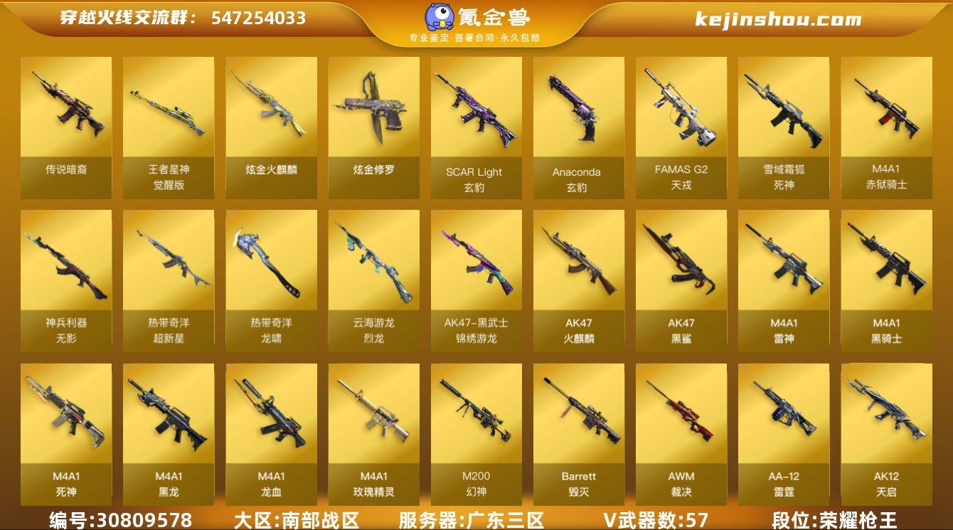 广东三区-60V-1王者-2炫金 【传说武器】:传说暗裔*2 【热门武器】:传说暗裔*2,QBZ03-金色蔷薇,Scar Light-白虎,HK417-朱雀,M200-幻神*2,死亡之眼,炼狱-迷你小钢,M4A1-黑骑士*4,汤姆逊-烈龙*2,RPK-盘龙*3,加特林-炼狱*2,羊驼玩偶,沙鹰-修罗,炽芒蝶刃 【王者炫金武器】:炫金火麒麟,炫金修罗 【音效卡】:M4A1-雷神音效卡,M4A1-黑骑士音效卡,死神-雪域霜狐-怀旧音效卡 【皮肤】:M200-幻神-黄忠皮肤*2,金色蔷薇-电竞之星 皮肤,裁决-胜者为王 皮肤,雷神-暗月,M4A1-雷神-新春神龙皮肤,雷神-源计划2.0专属 皮肤,AK47-火麒麟-百城23冠军皮肤,黑龙-能量核心,黑骑士耀金皮肤,黑骑士-战神马超,AK47-B-常胜将军-曹操,AK47-B-常胜将军-刘备,AWM-再燃火线 【角色】:荒漠琉璃,关小雨,王者樱-热浪之夏,雪域霜狐,蛇隐宗,奇洋探员,暗夜-X,芳心审判者,飞虎队-X,嘉年华灵狐,娟娟,灵狐者-X,麻雀,潘多拉-X,潘多拉-甜心教官,青霞仙子,蛇姬,斯沃特-X,兔囡囡,影武者-X,游珑儿 【人偶武器】:炼狱-迷你小钢,迷你钢铁终结者,迷你救赎猎手,斯泰尔-枪娘暗刃,AWM-灵狐-15周年嘉年华,迷你深渊冰龙*2,迷你裂空之翼*8,迷你波特博士*2,夺魂*2,迷你火种*2,迷你生化手雷*2,生化手雷-机甲核心*3,深渊终结者手雷*2,闪光弹-貂蝉,高爆手雷-大乔,迷你艾比,迷你巨石泰坦-魔花研究所,灵狐娃娃手雷*3 【暴走生化】:异变清道夫,死亡之眼,超级对讲机 【挑战大师】:冰龙粉碎者-白马银枪,机甲撕裂者III,试炼破坏者III,KAC-圣炎切割者III,神圣爆裂者-末日III 【英雄级武器】:AK47-火麒麟,M4A1-黑龙,M4A1-雷神,M4A1-黑骑士*4,M4A1-死神*2,AK12-天启,AK47-黑鲨,M4A1-龙血,HK417-朱雀,Scar Light-白虎,QBZ03-天罚,无影-神兵利器,黑武士-锦绣游龙,超新星-热带奇洋,FAMAS...