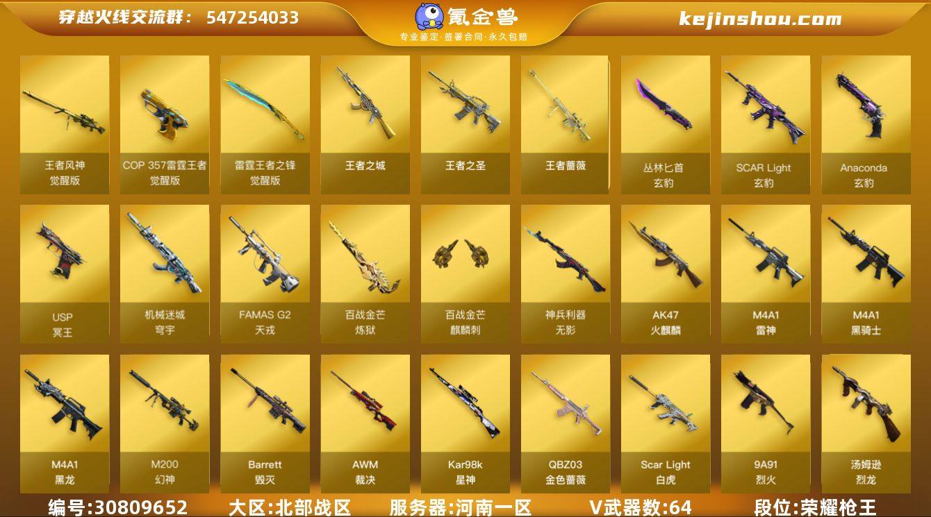 【FC-BES95C】【连体安q王者2水晶16传说1省标/四防传说星骇/四防玄豹/传说圣谕/幻神 冠军之幻 AG24/风神/天罚/qbz金色蔷薇 白鲨 冠军/玄豹套装/天戎/usp冥王*4/cop雷霆王者/裁决 音效卡 巅峰/斯泰尔蝴蝶】 河南一区,等级100,传说武器1,王者武器10,V武器64, 【英雄角色】传说星骇,玄豹,雷霆-α,猎狐者, 【传说武器】传说圣谕, 【V武器】M200-幻神,Kar98K-星神,Barrett-毁灭,AWM-裁决,FAMAS G2-天戎,Scar Light-白虎,SCAR Light-玄豹,QBZ03-天罚,QBZ03-金色蔷薇,加特林-炼狱,炼狱-百战金芒,汤姆逊-烈龙,USP-冥王,Anaconda-玄豹,炽芒蝶刃,M4A1-雷神,M4A1-黑骑士,M4A1-黑龙,AK47-火麒麟,AK47-B-战士,9A91-烈火,无影-神兵利器,黑武士-锦绣游龙,机械迷城-穹宇,沙鹰-修罗,沙鹰-天神,屠龙,丛林匕首-玄豹,龙啸,擎天,龙啸-烈火龙威,麒麟刺-百战金芒,高爆手雷-玄豹,闪光弹-玄豹,烟雾弹-玄豹,M4A1-再燃火线,AK-47-猩红传说, 【王者武器】王者风神-觉醒版,王者之城,王者之圣,王者蔷薇,COP 357-雷霆王者-觉醒版,王者冰锋,雷霆王者之锋-觉醒版,闪光弹-雷暴王者,高爆手雷-雷暴王者,王者风神-觉醒版, 【狙击枪稀有皮肤】幻神-冠军之幻,裁决-巅峰荣耀 皮肤,毁灭-冠军之怒,巴雷特SV皮肤,毁灭-英雄计划 皮肤, 【步枪稀有皮肤】白虎-百战金芒 皮肤,雷神-荣耀之魄,火麒麟-CFSTAR,黑骑士-AG-S4冠军典藏,QBZ03-荣耀世冠白鲨,QBZ03-冠军之薇,战神-紫绶金章皮肤, 【副武器稀有皮肤】修罗-CFSTAR,修罗-冠军之魂, 【近身武器稀有皮肤】龙啸-巅峰荣耀 皮肤,龙啸-冠军之啸,擎天-冠军之击,屠龙-春桃 皮肤, 【音效道具】AWM-裁决音效卡,炼狱-百战金芒-庆典舞曲音效卡, 【小人枪】巴雷特-零-水下丽影,魔能飞环-曼陀罗,AWM-灵狐-15周年嘉年华,生化手雷-机甲核心,火...
