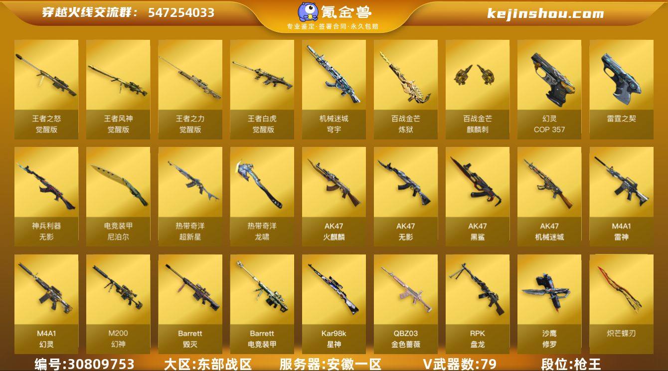 【FC-51hG2H】安徽一区,等级100,传说武器1,王者武器4,V武器79, 【英雄角色】传说影煞,关小雨,司雨,电竞教官-云悠悠,猎狐者,海豹突击队, 【传说武器】传说破晓, 【V武器】M200-幻神,M200-竞技荣光,Kar98K-星神,Barrett-电竞装甲,Barrett-毁灭,QBZ03-金色蔷薇,M4A1-幻灵,RPK-盘龙,炼狱-百战金芒,柯尔特-竞技荣光,柯尔特-电竞装甲,COP 357-幻灵,雷霆之契,炽芒蝶刃,M4A1-雷神,AK47-火麒麟,AK47-无影,AK47-黑鲨,AK47-机械迷城,烈火-动感闪耀,AA-12-雷霆,无影-神兵利器,机械迷城-穹宇,沙鹰-修罗,天神-动感闪耀,屠龙,擎天-竞技荣光,幻灵之锋,屠龙-动感闪耀,尼泊尔-电竞装甲,龙啸-烈火龙威,麒麟刺-百战金芒,闪光弹-电竞装甲,烟雾弹-电竞装甲,高爆手雷-幻灵,闪光弹-幻灵,烟雾弹-幻灵,高爆手雷-竞技荣光,闪光弹-竞技荣光,烟雾弹-竞技荣光,超新星-热带奇洋,龙啸-热带奇洋,恶棍-电竞装甲,手雷-热带奇洋,手雷-动感闪耀,M4A1-再燃火线, 【王者武器】王者风神-觉醒版,王者白虎-觉醒版,王者之力-觉醒版,王者风神-觉醒版,王者之怒-觉醒版, 【狙击枪稀有皮肤】幻神-纸灯龙皮肤,幻神-宠儿-2021MVP,M200-幻神-N9-2022MVP,幻神-电流骇客 皮肤,星神-璀璨皮肤,毁灭-魔灵皮肤,毁灭-黑大圣皮肤,天龙-CFSTAR, 【步枪稀有皮肤】白虎-百战金芒 皮肤,M4A1-雷神-赛博朋克,雷神-荣耀之魄,雷神-宠儿-2019MVP,雷神-虎将,火麒麟-CFSTAR,火麒麟-白虎,火麒麟-心动糖果,火麒麟-华夏之心,火麒麟-平天大圣,火麒麟-荣耀世冠AG,AK-47-雷神,黑骑士-破界 皮肤,黑鲨-电流骇客 皮肤, 【副武器稀有皮肤】修罗-CFSTAR, 【近身武器稀有皮肤】屠龙-春桃 皮肤, 【音效道具】Barrett-毁灭音效卡,Barrett-碧霄极光音效卡,M4A1-雷神音效卡,AK47-火麒麟音效卡,炼狱-百战金芒...