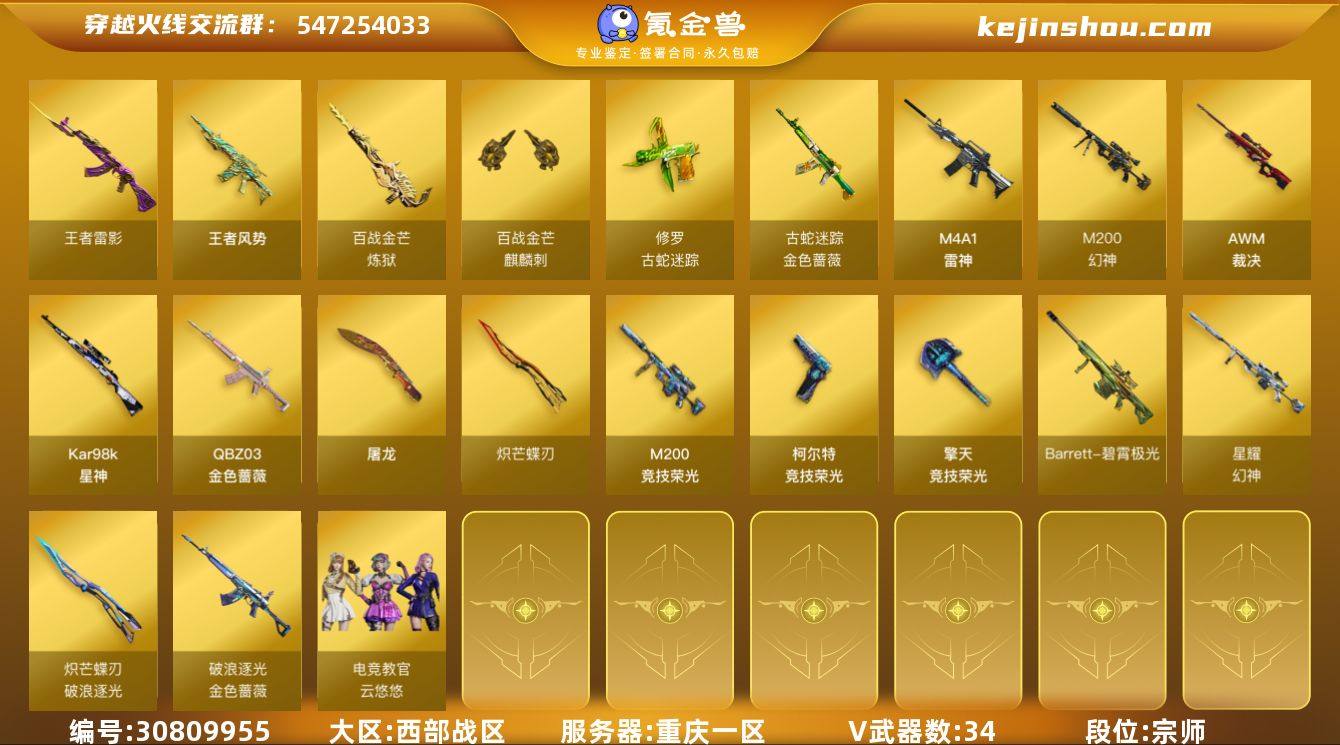 重庆一区-37V-2王者-0炫金 【热门武器】:QBZ03-金色蔷薇,M200-幻神,金色蔷薇-古蛇迷踪,修罗-古蛇迷踪,M200-竞技荣光*2,Kar98K-星神,炽芒蝶刃,炽芒蝶刃-破浪逐光 皮肤 【王者炫金武器】:王者风势,王者雷影 【音效卡】:M4A1-雷神音效卡,Kar98K-星神音效卡,Barrett-碧霄极光音效卡,炼狱-百战金芒-庆典舞曲音效卡 【皮肤】:幻神-星耀 皮肤,金色蔷薇-破浪逐光 皮肤,裁决-羽掣 皮肤,雷神-化蛇 皮肤,M4A1-再燃火线,屠龙-破浪逐光 皮肤,轻型军用手斧-再燃火线,炽芒蝶刃-破浪逐光 皮肤 【角色】:电竞教官-云悠悠,雪域霜狐,蛇隐宗,修道士,暗夜-X,电竞少女,芳心审判者,0号玩家,青霞仙子,蛇姬,斯沃特-X,兔囡囡,维纳斯,雪莉杨,雪莉杨-摸金校尉,夜玫瑰-宠粉,智影 【人偶武器】:迷你钢铁终结者,迷你深渊冰龙*2,夺魂,迷你牛牛,生化手雷-机甲核心*2,M4A1-斯沃特 【暴走生化】:超级对讲机 【英雄级武器】:M4A1-雷神*2,金色蔷薇-古蛇迷踪,QBZ03-金色蔷薇,AWM-裁决,M200-幻神,Kar98K-星神,M200-竞技荣光*2,炼狱-百战金芒,柯尔特-竞技荣光,修罗-古蛇迷踪,屠龙,擎天-竞技荣光,炽芒蝶刃,麒麟刺-百战金芒,高爆手雷-竞技荣光*5,高爆手雷-古蛇迷踪,闪光弹-竞技荣光*5,烟雾弹-竞技荣光*5,烟雾弹-古蛇迷踪,Barrett-碧霄极光 【道具】:BS战队炫彩背包,CFS限定背包,亚洲杯纪念炫彩背包,冰冰企鹅背包-猛男专用,古蛇迷踪炫彩背包,女皇终结者-背包,百战金芒炫彩背包,老虎背包,超级背包,迷你冰龙背包,圣拳猎手-炽雪,终极猎手-荒漠刀客,终极猎手-秦魂将军,女皇终结者-魔龙之吻,救世主-黑桃战神,黄金生化钩,绿色巨人,灵魂忍者,变异宝贝,迷雾幽灵,夺命之镰,防化服*4,巅峰赛先锋-金色流光,流光-鎏金之域,枪王排位28赛季金色流光,枪王排位29赛季金色流光,...