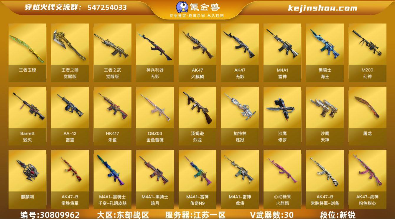 江苏一区-33V-6王者-0炫金 【热门武器】:QBZ03-金色蔷薇*2,HK417-朱雀,M200-幻神,死亡之眼,Cat-刀锋,汤姆逊-烈龙*6,加特林-炼狱,火麒麟-绝迹,COP-白鲨*2,沙鹰-修罗*2,黄金猫猫手套-白鲨 【王者炫金武器】:王者玉锋 【音效卡】:加特林-炼狱音效卡 【皮肤】:幻神-宠儿-2021MVP,M200-幻神-荣耀世冠白鲨,M200-幻神-N9-2022MVP,QBZ03-荣耀世冠白鲨,雷神-虎将,雷神-传奇N9,火麒麟-冠军之心,火麒麟-心动糖果,毁灭-暗月,毁灭-荣耀之怒,毁灭耀金皮肤,M4A1-千变-孔明皮肤,黑骑士-暗月,无影-能量核心,战神-粉色甜心皮肤,AK47-B-常胜将军-刘备,修罗-冠军之魂 【角色】:零,魅影,谜,北极狐-X,风暴女,嘉年华灵狐,兰妹妹,0号玩家,龙儿-小淘气,潘多拉-X,潘多拉-甜心教官,斯沃特-X,铁骑荣耀,职业选手 【人偶武器】:火麒麟-绝迹,COP-白鲨*2,火麒麟-灵狐,AWM-灵狐-15周年嘉年华,Cat-刀锋,迷你深渊冰龙,生化手雷-机甲核心*2,深渊终结者手雷,闪光弹-貂蝉,高爆手雷-大乔 【暴走生化】:死亡之眼 【挑战大师】:AK47-冰龙粉碎者,神圣爆裂者III,激光毁灭者III-白马银枪,激光毁灭者III,神圣爆裂者-末日III*2 【英雄级武器】:AK47-火麒麟*2,M4A1-雷神,AK47-无影,HK417-朱雀,无影-神兵利器,QBZ03-金色蔷薇*2,王者之武-觉醒版,黑骑士-海王,AK47-B-常胜将军,Barrett-毁灭*2,M200-幻神,加特林-炼狱,汤姆逊-烈龙*6,AA-12-雷霆,沙鹰-修罗*2,沙鹰-天神*3,屠龙*2,麒麟刺,王者之啸-觉醒版 【特殊枪械】:6烈龙,1炼狱