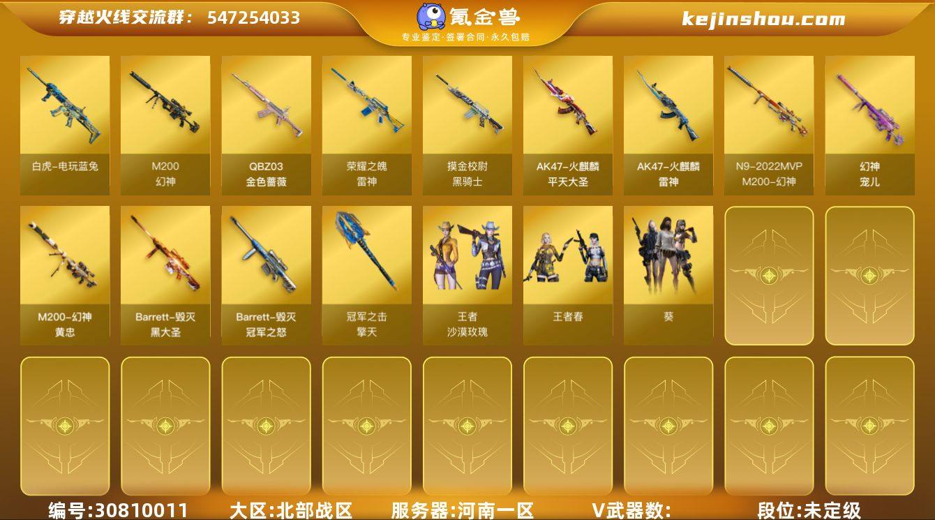 TB7332/北部/河南一区/可排位/54V/幻神/幻神宠儿/幻神N9/幻神黄忠/QBZ金色蔷薇/白虎电玩蓝兔/【四防已开】/王者春/王者沙漠玫瑰/【角色】/葵/奇洋探员/乔伊教练/云海玲珑/【音效卡】/修罗云海游龙音效卡/【皮肤】/雷神机甲刑天/黑骑士摸金校尉/擎天冠军之击/火麒麟雷神/毁灭墨兰/战神紫绶金章/毁灭冠军之怒/毁灭黑大圣/火麒麟平天大圣/雷神荣耀之魄/【小人枪】/马枪/永久AC/神工天巧手雷套*3/雷霆手雷套/