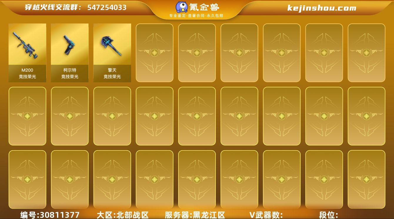 北京一区-34V-0王者武器数-0炫金武器数 【热门武器】:QBZ03-金色蔷薇,M14EBR-玄武,M4A1-青龙,M200-幻神,金色蔷薇-古蛇迷踪,修罗-古蛇迷踪,白虎-电玩蓝兔,毁灭-孙三炮*2 【音效卡】:沙鹰-修罗-盛典舞曲音效卡*2,麒麟刺-百战金芒-盛典舞曲音效卡,炼狱-百战金芒-庆典舞曲音效卡,死神-雪域霜狐-怀旧音效卡 【皮肤】:幻神-冠军之幻,M200-幻神-N9-2022MVP,雷神-暗月,M4A1-战神赵云,雷神-R.LGD-CFPLS18冠军,M4A1-雷神-巅峰荣耀皮肤,M4A1-再燃火线,毁灭-暗月,毁灭-星空,黑骑士-AG-S4冠军典藏,修罗-星空,轻型军用手斧-再燃火线 【角色】:隼,战地猎狐,王者潘多拉,雪域霜狐,蛇隐宗,乔伊教练,云海玲珑,暗夜-X,飞虎队-X,风暴女,虎妞,嘉年华灵狐,灵动武士,灵狐者-X,龙儿,曼陀罗-X,潘多拉-X,潘多拉-甜心教官,潜龙队-X,青霞仙子,蛇姬,斯沃特-X,铁骑荣耀,夜玫瑰-幻能朋克 【人偶武器】:毁灭-孙三炮*2,天龙-曼陀罗,M4A1-雷神-精英刀锋,迷你救赎猎手,AWM-灵狐-15周年嘉年华,COP-旗袍,迷你裂空之翼,迷你波特博士*3,夺魂,迷你火种*2,生化手雷-机甲核心 【挑战大师】:冰龙粉碎者-白马银枪,激光毁灭者III-白马银枪,试炼破坏者III 【英雄级武器】:AK47-火麒麟,M4A1-雷神,AN94-超新星,M4A1-青龙,M14EBR-玄武,无影-神兵利器,金色蔷薇-古蛇迷踪,死神-雪域霜狐,QBZ03-金色蔷薇,黑骑士-海王,白虎-电玩蓝兔,Barrett-毁灭,M200-幻神,炼狱-百战金芒,柯尔特-电竞之星,修罗-古蛇迷踪,幻灵之锋,麒麟刺-百战金芒,高爆手雷-幻灵*3,手雷-云海游龙,高爆手雷-古蛇迷踪,闪光弹-幻灵*2,烟雾弹-幻灵*2,烟雾弹-古蛇迷踪,M4A1-赤狱骑士,M4A1-苍鸣雷神 【道具】:BS战队炫彩背包,CFS限定背包,云山科技背包,古蛇迷踪炫彩背包,牛魔王背包-至尊黄金,百战金芒炫彩背包...