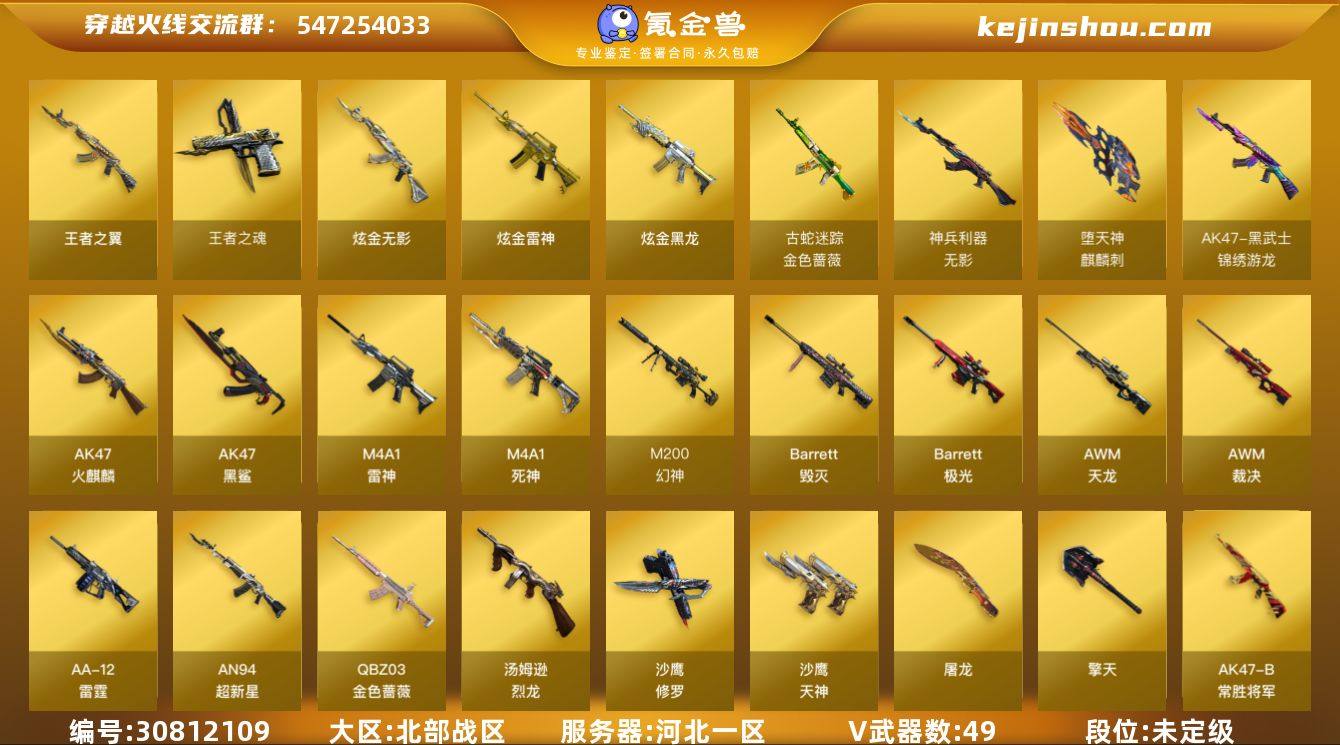【商品标题】:河北一区-51V-7王者-3炫金 【热门武器】:QBZ03-金色蔷薇,M200-幻神,柯尔特-荣耀世冠白鲨2023,金色蔷薇-古蛇迷踪,修罗-古蛇迷踪,死亡之眼,汤姆逊-烈龙*6,USP-钞能力灵狐,沙鹰-修罗*3 【王者炫金武器】:炫金无影,炫金黑龙,炫金雷神,王者之翼,王者之魂 【音效卡】:M4A1-黑骑士音效卡*2,Barrett-毁灭音效卡 【稀有皮肤】:幻神-周瑜皮肤,雷神-能量核心,火麒麟-平天大圣,毁灭-黑大圣皮肤,修罗-星空 【角色】:炫,铁骑荣耀 【人偶武器】:USP-钞能力灵狐,闪光弹-貂蝉,高爆手雷-大乔 【暴走生化】:死亡之眼,超级对讲机 【挑战大师】:阐释者III,激光毁灭者III 【英雄级武器】:麒麟刺-堕天神,QBZ03-金色蔷薇,金色蔷薇-古蛇迷踪,无影-神兵利器,M4A1-雷神*2,M4A1-死神,汤姆逊-烈龙*6,AK47-火麒麟,AN94-超新星,AWM-天龙,Barrett-毁灭,Barrett-极光,AWM-裁决,AA-12-雷霆,M200-幻神,AK47-黑鲨,黑武士-锦绣游龙,AK47-B-常胜将军,M4A1-赤狱骑士,修罗-古蛇迷踪,沙鹰-天神*3,沙鹰-修罗*3,擎天,屠龙*4 【特殊枪械】:6烈龙