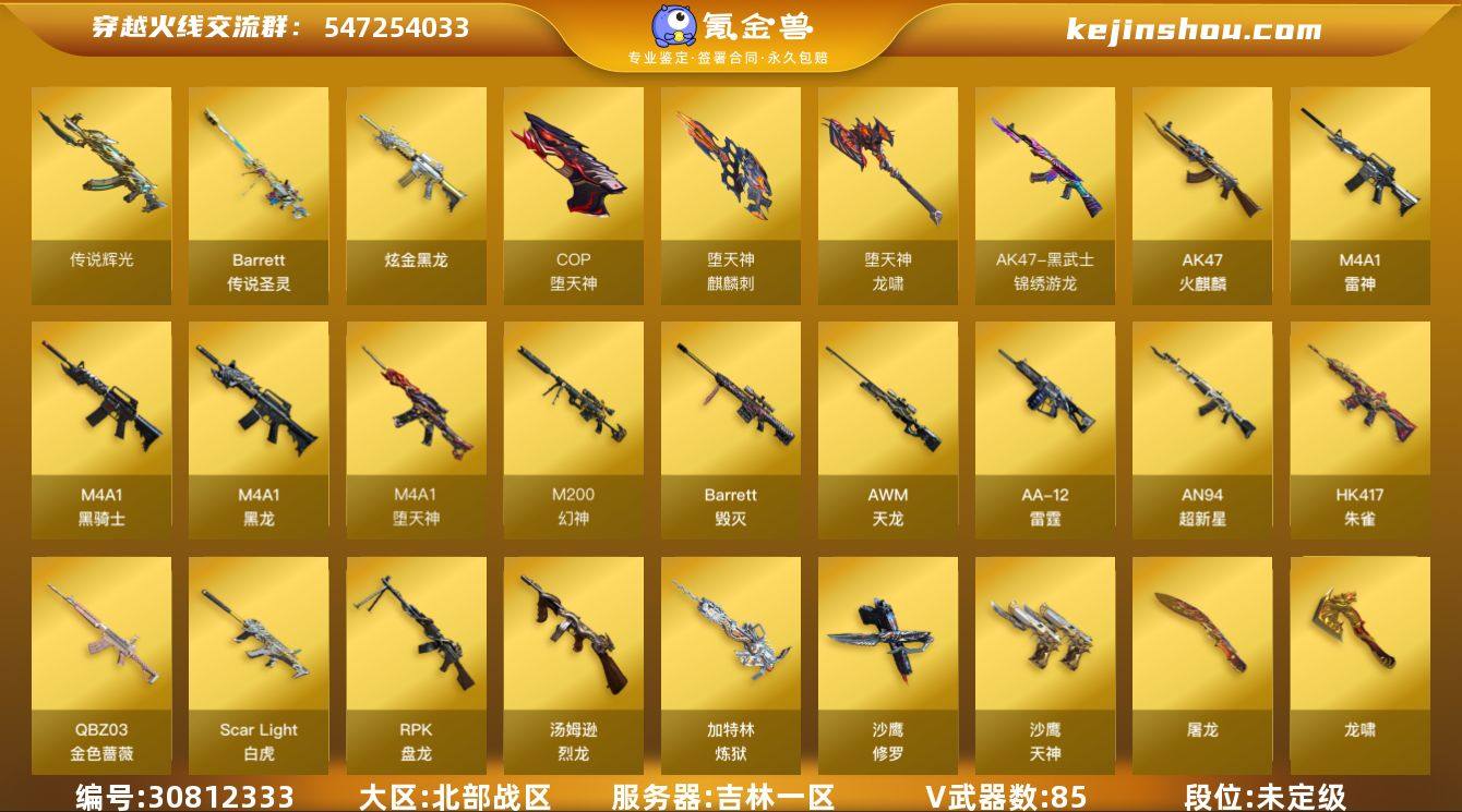 【商品标题】:吉林一区-89V-14王者-1炫金 【传说武器】:传说圣灵,传说辉光 【热门武器】:传说圣灵,传说辉光,QBZ03-金色蔷薇,Scar Light-白虎,HK417-朱雀,M200-幻神,M200-竞技荣光,死亡之眼,荣耀世冠-雷神,毒蜂,牛牛-AK47,M4A1-黑骑士,汤姆逊-烈龙*6,RPK-盘龙*5,加特林-炼狱*2,羊驼玩偶,裁决-雪莉杨,USP-雷暴,COP-堕天神,沙鹰-修罗*2,金刚伞 【王者炫金武器】:炫金黑龙 【音效卡】:AK47-火麒麟音效卡,M4A1-黑骑士音效卡 【稀有皮肤】:幻神-周瑜皮肤,雷神-冠军之魄,雷神-杨戬,火麒麟-华夏之心,火麒麟-轻羽皮肤,火麒麟-平天大圣,火麒麟-百城,炼狱-星空,毁灭耀金皮肤,毁灭-冠军之怒,毁灭-SV-CFPLS16冠军,毁灭-黑大圣皮肤 【角色】:王者-葵-貂蝉,灵狐者-职业经理,迷迭香,雨棠,电竞教官-云悠悠,鹰,铁骑荣耀 【人偶武器】:裁决-雪莉杨,天龙-曼陀罗,巴雷特-零-水下丽影,AWM-灵狐-15周年嘉年华,COP-旗袍,牛牛-AK47,迷你艾比,迷你波特博士,夺魂,迷你牛牛,迷你生化手雷,深渊终结者手雷,闪光弹-貂蝉,高爆手雷-大乔 【暴走生化】:毒蜂,死亡之眼,黑龙吞噬者,超级对讲机 【挑战大师】:阐释者III,激光毁灭者III-白马银枪,冰龙粉碎者-白马银枪*2 【英雄级武器】:M200-竞技荣光,柯尔特-竞技荣光*2,擎天-竞技荣光,高爆手雷-竞技荣光*3,烟雾弹-竞技荣光*3,闪光弹-竞技荣光*5,M4A1-堕天神,COP-堕天神,麒麟刺-堕天神,龙啸-堕天神*3,USP-雷暴,荣耀世冠-雷神,QBZ03-金色蔷薇,Scar Light-白虎,HK417-朱雀,M4A1-雷神,M4A1-黑龙,M4A1-黑骑士,RPK-盘龙*5,加特林-炼狱*2,汤姆逊-烈龙*6,AK47-火麒麟,AN94-超新星,AWM-天龙,Barrett-毁灭,AA-12-雷霆,M200-幻神,黑武士-锦绣游龙,AK47-B-常胜将军,M4A1-赤狱骑士,沙鹰-天神*2,沙鹰-修罗*2,擎天...