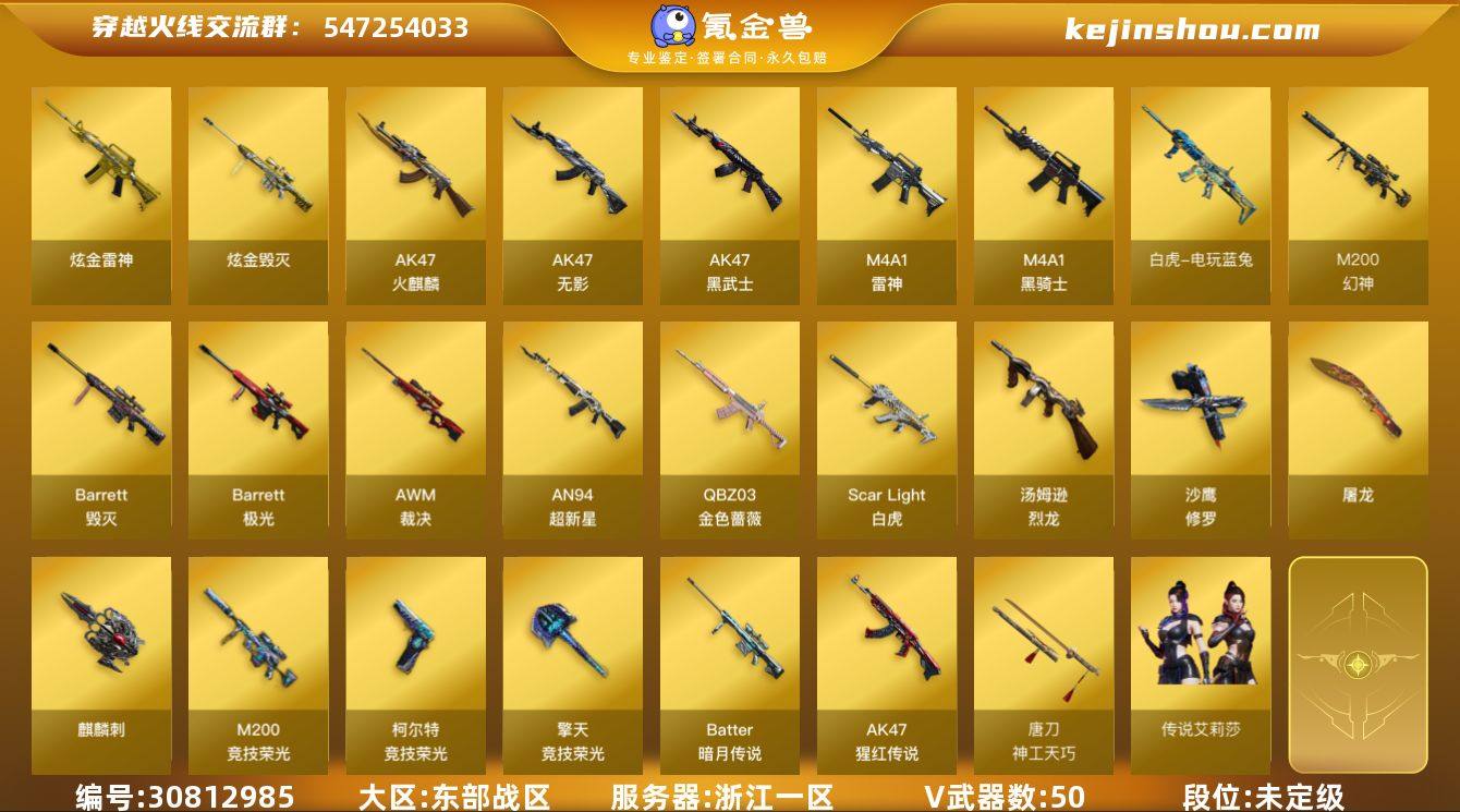 [15553869]9568/东部/浙江一区/可排位/【传奇3】【Lv.102 荣耀元帅】VIP6/50V/【四防】/传说艾莉莎/幻神/幻神黄忠/王者星神/M200竞技荣光套/白虎/白虎暗星/白虎之魄/白虎电玩蓝兔/QBZ金色蔷薇/*2/QBZ金色蔷薇拼搏/金色蔷薇枪娘阿敏/QBZ王者蔷薇/柯尔特冠军之特/柯尔特竞技荣光/一套玄豹手雷/【皮肤音效卡】/毁灭魔灵/雷神拼搏/炼狱百战金芒庆典舞曲音效卡/修罗盛典舞曲音效卡/【角色】/枪娘樱/流浪蔷薇/女战神/葵阿尔法武装/奇洋探员/乔伊教练/云海玲珑/【玩偶武器】/雷神精英刀锋/火麒麟绝迹/天龙曼陀罗/Cat刀锋/夺魂/迷你深渊冰龙/【挑战】/集束激光超越MAX/征服者超越5///各种饰品/各种道具/细节看图/【此账号未被封过十年】