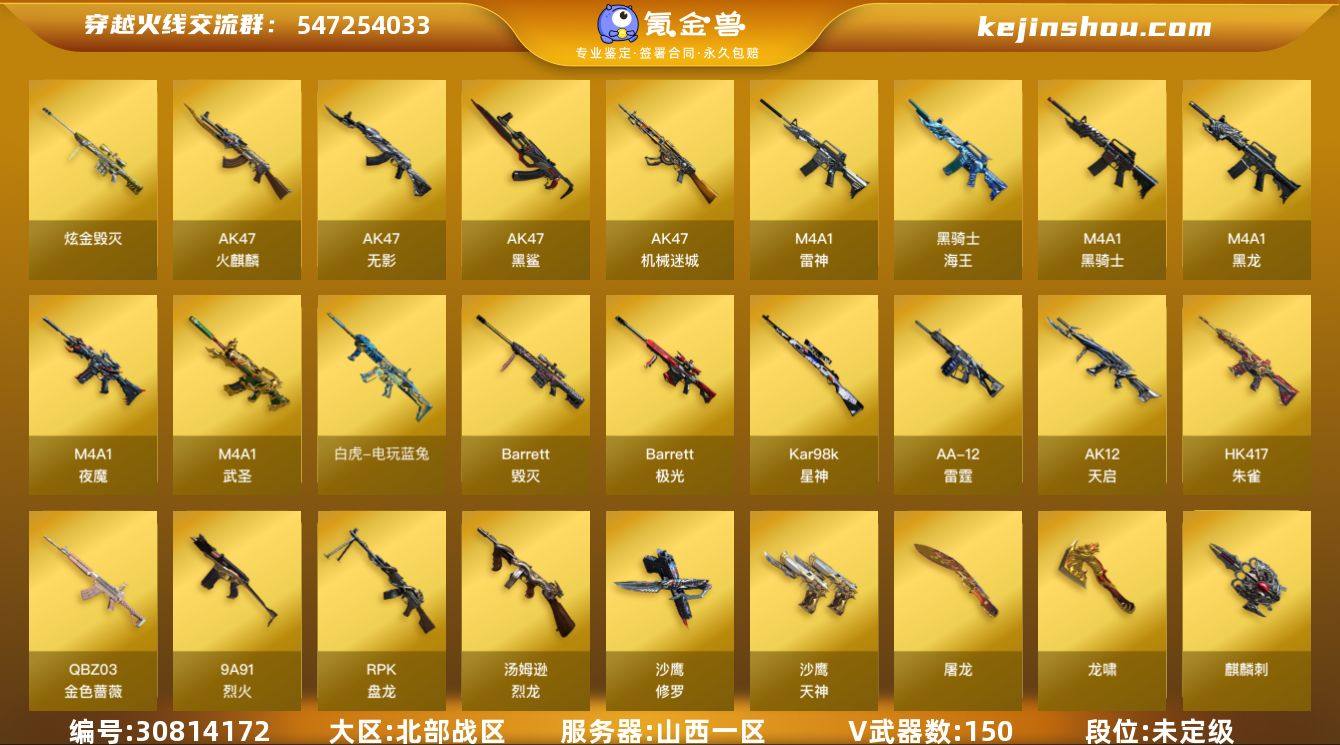 陕西一区-70V-6王者-0炫金 【热门武器】:QBZ03-金色蔷薇,HK417-朱雀,M200-幻神,荣耀世冠-柯尔特,M4A1-黑骑士*2,USP-雷暴,沙鹰-修罗*2 【音效卡】:AK47-火麒麟音效卡,M4A1-雷神音效卡,M4A1-黑骑士音效卡,Barrett-毁灭音效卡,Barrett-碧霄极光音效卡*2,白虎-盛典舞曲音效卡,炼狱-百战金芒-庆典舞曲音效卡 【皮肤】:幻神-丹凤,幻神-青鹤,幻神-KZ-CFPLS25冠军 皮肤,QBZ03-荣耀世冠白鲨,QBZ03-CFS2024 皮肤*2,Kar98K-星神-AG-CFPLS21冠军皮肤,雷神-冠军之魄,雷神-CFS十周年纪念版 皮肤,M4A1-再燃火线,火麒麟-雷神*2,火麒麟-平天大圣,火麒麟-心动糖果,毁灭-CFS2020,黑龙-暗月,屠龙-巅峰荣耀 皮肤,轻型军用手斧-再燃火线,麒麟刺-甜蜜糖果 皮肤 【角色】:零,迷迭香,电竞教官-云悠悠,王者-瞳-闭月羞花,王者-零,王者玲珑,乔伊教练,云海玲珑,初恋灵狐,电竞少女,嘉年华灵狐,娟娟,猎狐者-追月,零-水下丽影,灵狐者-X,麻雀,潘多拉-X,潘多拉-甜心教官,莎莎,斯沃特-X,铁骑荣耀,樱-战斗天使,影武者-X,游珑儿 【人偶武器】:AWM-灵狐-15周年嘉年华,迷你深渊冰龙*2,迷你波特博士,夺魂,深渊终结者手雷,迷你艾比 【暴走生化】:超级对讲机 【挑战大师】:AK47-冰龙粉碎者,冰龙粉碎者-白马银枪,VEPR-12-金魔,激光毁灭者III,神圣爆裂者-末日III 【英雄级武器】:M4A1-千变,AK47-火麒麟*2,M4A1-黑龙,M4A1-雷神*3,M4A1-黑骑士*2,HK417-朱雀,M4A1-夜魔,无影-神兵利器,黑武士-锦绣游龙,QBZ03-金色蔷薇,王者之心-觉醒版,王者之魄-觉醒版,黑骑士-海王,AWM-天龙*3,Barrett-毁灭,Barrett-极光,AWM-裁决,M200-幻神,王者之怒-觉醒版,王者之力-觉醒版,炼狱-百战金芒,AA-12-雷霆,沙鹰-修罗*2,沙鹰-天神,USP-雷暴,荣耀世