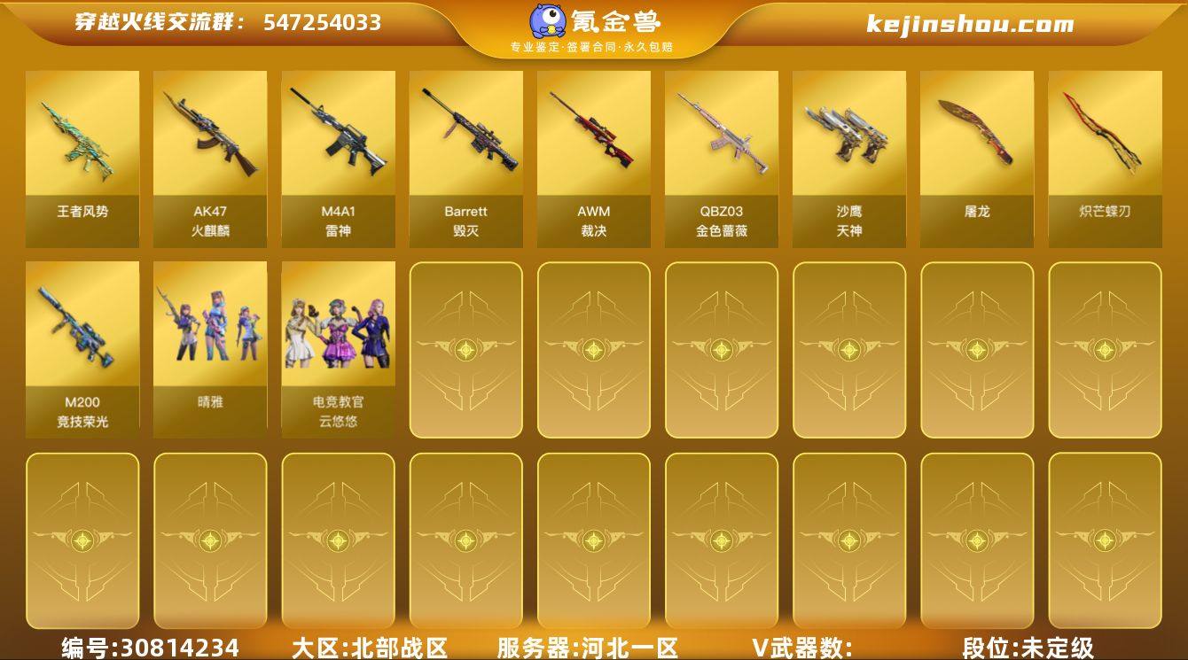 湖北一区-43V-11王者-5炫金 【热门武器】:M200-幻神,死亡之眼,C.A.T,M4A1-黑骑士*3,汤姆逊-烈龙*7,RPK-盘龙,沙鹰-修罗 【王者炫金武器】:王者之戮*2,王者之翼,王者之光,王者之力*2,炫金雷神,炫金武士*2,炫金超新星,炫金毁灭,王者之魄闪光弹 【音效卡】:AK47-火麒麟音效卡,M4A1-雷神音效卡,M4A1-黑骑士音效卡,Barrett-毁灭音效卡 【皮肤】:幻神-丹凤,雷神-星空,雷神-虎将,雷神-耀金皮肤,雷神-宇航兔皮肤,火麒麟-雷神,火麒麟-百城,火麒麟-心动糖果,毁灭-黑大圣皮肤,毁灭-神秘黑洞皮肤,毁灭-英雄计划 皮肤,黑龙-能量核心,黑龙-暗月,黑龙-墨子皮肤,黑骑士-电玩青兔皮肤,无影耀金皮肤,AK47-B-常胜将军-曹操,AK47-B-常胜将军-刘备,天龙-能量核心,极光-能量核心,修罗-能量核心*2,屠龙-荣耀之锋 【角色】:零,乔伊教练,初恋灵狐,风暴女,虎妞,嘉年华灵狐,娟娟,零-水下丽影,龙儿-小淘气,麻雀,潘多拉-X,青霞仙子,莎莎,斯沃特-X,蜀雪,铁骑荣耀,兔囡囡,新娜塔莎,樱-战斗天使,影武者-X 【人偶武器】:火麒麟-灵狐,AWM-灵狐-15周年嘉年华,M37-葵,C.A.T,夺魂,生化手雷-机甲核心,迷你超能女侍 【暴走生化】:死亡之眼,超级对讲机 【挑战大师】:神圣爆裂者III,冰龙粉碎者-白马银枪,激光毁灭者III*3,试炼破坏者III,神圣爆裂者-末日III,阐释者III 【英雄级武器】:AK47-火麒麟*2,M4A1-黑龙,M4A1-雷神*4,M4A1-黑骑士*3,M4A1-死神,AK47-黑武士,AK12-天启,AK47-机械迷城*2,M4A1-龙血,无影-神兵利器,王者之心-觉醒版,王者之势-觉醒版,王者之幻-觉醒版,AWM-天龙,Barrett-毁灭,AWM-裁决,M200-幻神,Barrett-朱雀,RPK-盘龙,汤姆逊-烈龙*7,沙鹰-修罗,沙鹰-天神*3,屠龙*4,龙啸,擎天,麒麟刺,王者之击-觉醒版,手雷-动感闪耀 【道具】:全能...