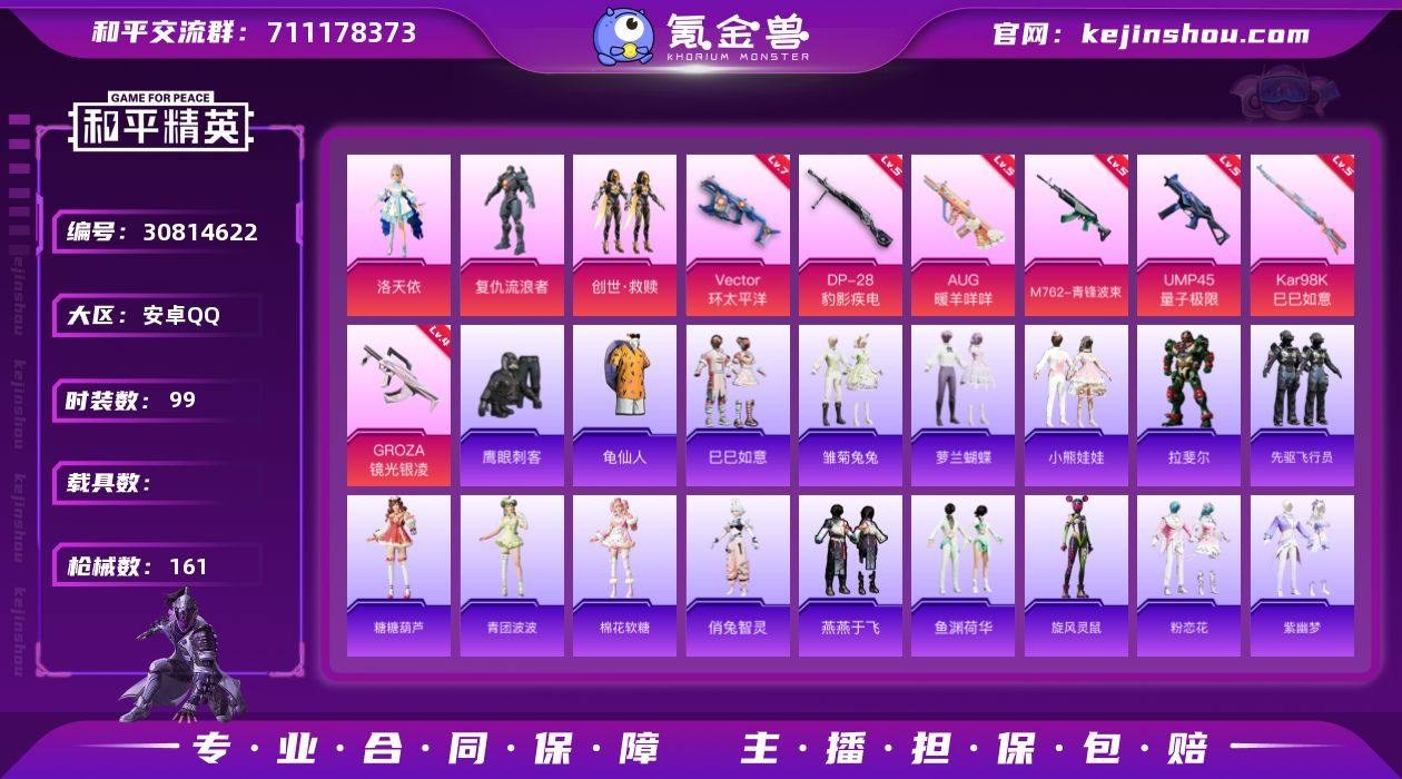 安卓 手Q-3粉装-7特效枪-0载具-3粉色飞行器-47270热力值-3王牌印记-99套装-161枪皮 【热门品类】:套装-龟仙人 【粉色套装】:角色-洛天依,角色-复仇流浪者,套装-创世·救赎 【粉色枪皮等级】:GROZA-镜光银凌(四级),AUG-暖羊咩咩(五级),M762-青锋波束(五级),UMP45-量子极限(五级),Vector-环太平洋(七级),Kar98K-巳巳如意(五级),DP-28-豹影疾电(五级) 【粉色枪皮】:GROZA-镜光银凌,AUG-暖羊咩咩,M762-青锋波束,UMP45-量子极限,Vector-环太平洋,Kar98K-巳巳如意,DP-28-豹影疾电 【粉色飞行器】:英伦信使飞行器,BEARBRICK飞行器,圣域金龙飞行器 【粉色降落伞】:海渊国主降落伞,环太平洋降落伞,万古烈焰降落伞,守护天翼降落伞,忍者神龟降落伞,精灵之光降落伞 【稀有套装】:套装-龟仙人,套装-巳巳如意,套装-雏菊兔兔,套装-萝兰蝴蝶,套装-小熊娃娃,角色-拉斐尔,套装-先驱飞行员,套装-糖糖葫芦,套装-青团波波,套装-棉花软糖,角色-俏兔智灵,套装-燕燕于飞,套装-鱼渊荷华,套装-旋风灵鼠,套装-粉恋花,套装-紫幽梦,套装-蓝冰羽,角色-猎影月神 【稀有枪皮】:AKM-彩虹符号,AKM-灼热熔岩,AKM-环太平洋,AKM-破晓战魂,AKM-霓虹街区,M16A4-幻世战舞者,M16A4-甜心亚梦,M16A4-红色方程式,SCAR-L-兔兔白日梦,SCAR-L-炫彩节奏,SCAR-L-玉兔迎春,SCAR-L-红色方程式,M416-夜灯,M416-红色方程式,M416-蓝色火焰,GROZA-异彩先驱,AUG-天降萌叽,AUG-耀粉歌者,AUG-月影灵韵,QBZ-彩虹符号,QBZ-飞驰魅影,M762-天降萌叽,M762-瑞龙福将,Mk47-洛神天依,AC-VAL-天降萌叽,AC-VAL-甜心亚梦,蜜獾-天降萌叽,蜜獾-娇憨猪猪,Famas-镜域双华,UZI-天降萌叽,UZI-娇憨猪猪,UZI-炫彩节奏,UZI-红色方程式,UMP45-夜灯,UMP45-炫光之旅,UMP45-蓝色火焰,Vector-暗夜玫瑰,汤姆逊-异彩...