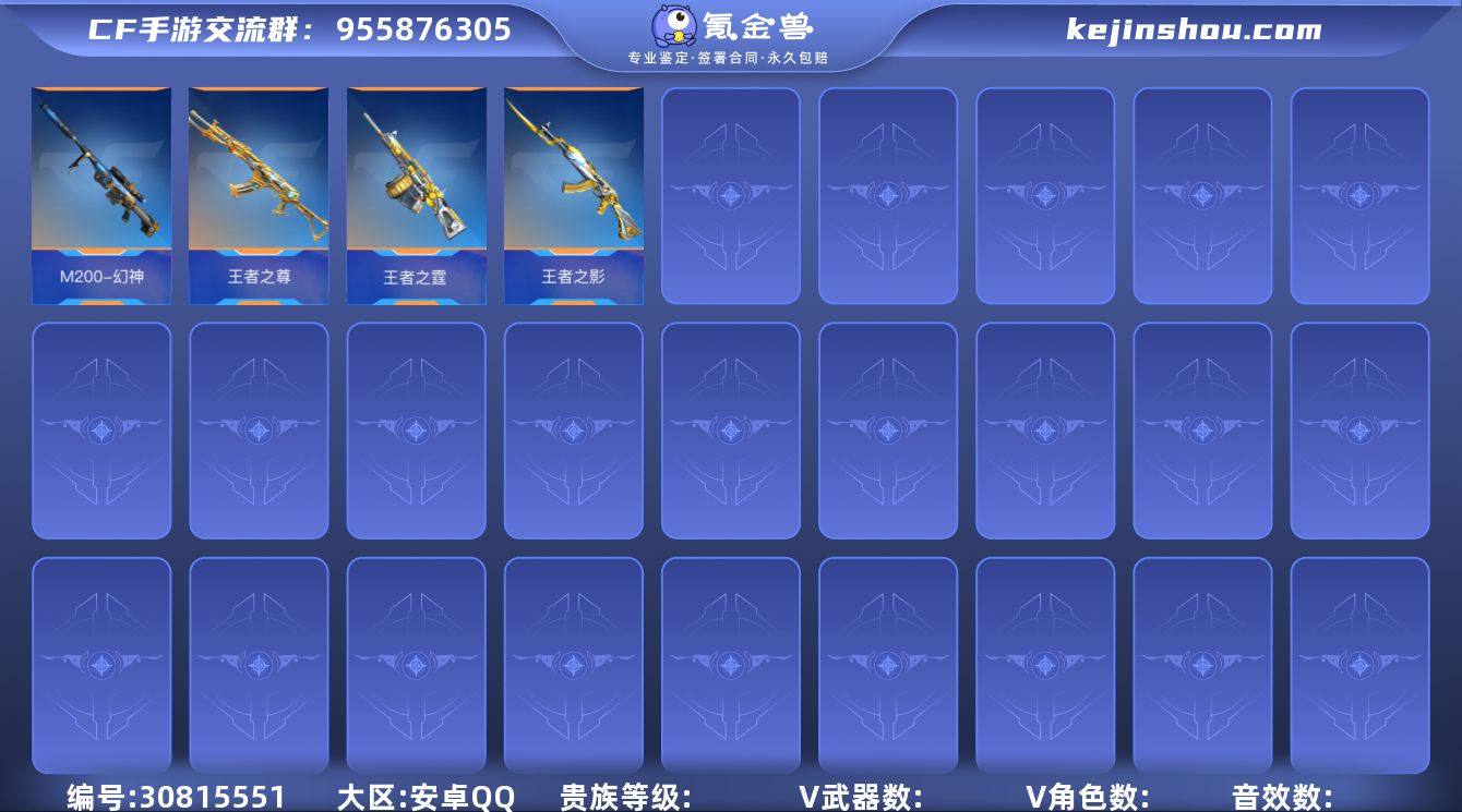 【FC-Y78U】9王者300赏金币-仲康套-盖-仲达套-妙才-幻神-仁德-慈-孟获-天公-逆骨-竞技套 手Q-安卓,等级150,VIP0,V武器数:440 ,V角色数:9 【人物角色】孙悟空,牛妹,关小雨,海滩夜玫瑰,由乃,太阳神-曦,幽灵刀锋,幽灵刀锋-觉醒,大老师,堕天使,周年庆纪念赛斯,波塞冬,运动宝贝兰,葵,铁骑,洛伊,夏日灵狐,暗影,春节兰,夜玫瑰-2017,圣诞灵狐,刀锋-2017,魅惑灵狐,曼陀罗,幻影,幻影,幻影,夜玫瑰,赛斯,潘多拉,猎狐者,奥摩,斯沃特,秦师,炽天使-X,云悠悠-心动起点,奥妹,蜀雪,变装舞会兰,月神-X,职场灵狐,职场灵狐-赛事经理,斯薇特, 【王者武器】王者之誉,王者之兽,蝴蝶刀-天神,唐刀-华夏传说,M12S-雷霆王者,王者之蝶,王者之心烟雾弹,王者之心闪光弹,王者之心,王者之影,王者之魂, 【带V枪械】47-云舞-千变,M4A1-冰锋觉醒,M4A1-海骑士,M4A1-赛博雷神,M4A1-机械迷城,M4A1-仲达,M4A1-龙血,M4A1-樱龙·二觉,M4A1-卧龙,M4A1-玫瑰精灵,M4A1-死神,M4A1-死神,M4A1-死神,M4A1-黑骑士,M4A1-黑骑士,M4A1-雷神,M4A1-雷神,M4A1-雷神,47-云舞,47-仁德,AK47-血武士,AK47-血武士,AK47-心动次元,AK47-沙漠郡主-超觉,AK47-沙漠郡主-二觉,AK47-沙漠郡主-一觉,AK47-沙漠郡主-一觉,AK47-猩红传说,AK47-机械迷城,AK47-冰魂觉醒,AK47-麒麟,AK47-火麒麟,AK47-火麒麟,AK47-火麒麟,AK47-无影,AK47-无影,81式-光明之神,AN94-卷帘大将军,HK416-混世行者,M14EBR-天神,QBZ19-天使,AUG-机械纪元,AUG-机械纪元,QBZ03-湮灭,QBZ03-金色蔷薇,QBZ03-金色蔷薇,QBZ03-金色蔷薇,98K-血月,98K-黑骑士,AK12-天启,M200-心动次元觉醒,M200-幻神,巴雷特-极光,巴雷特-极光,巴雷特-极光,巴雷特-