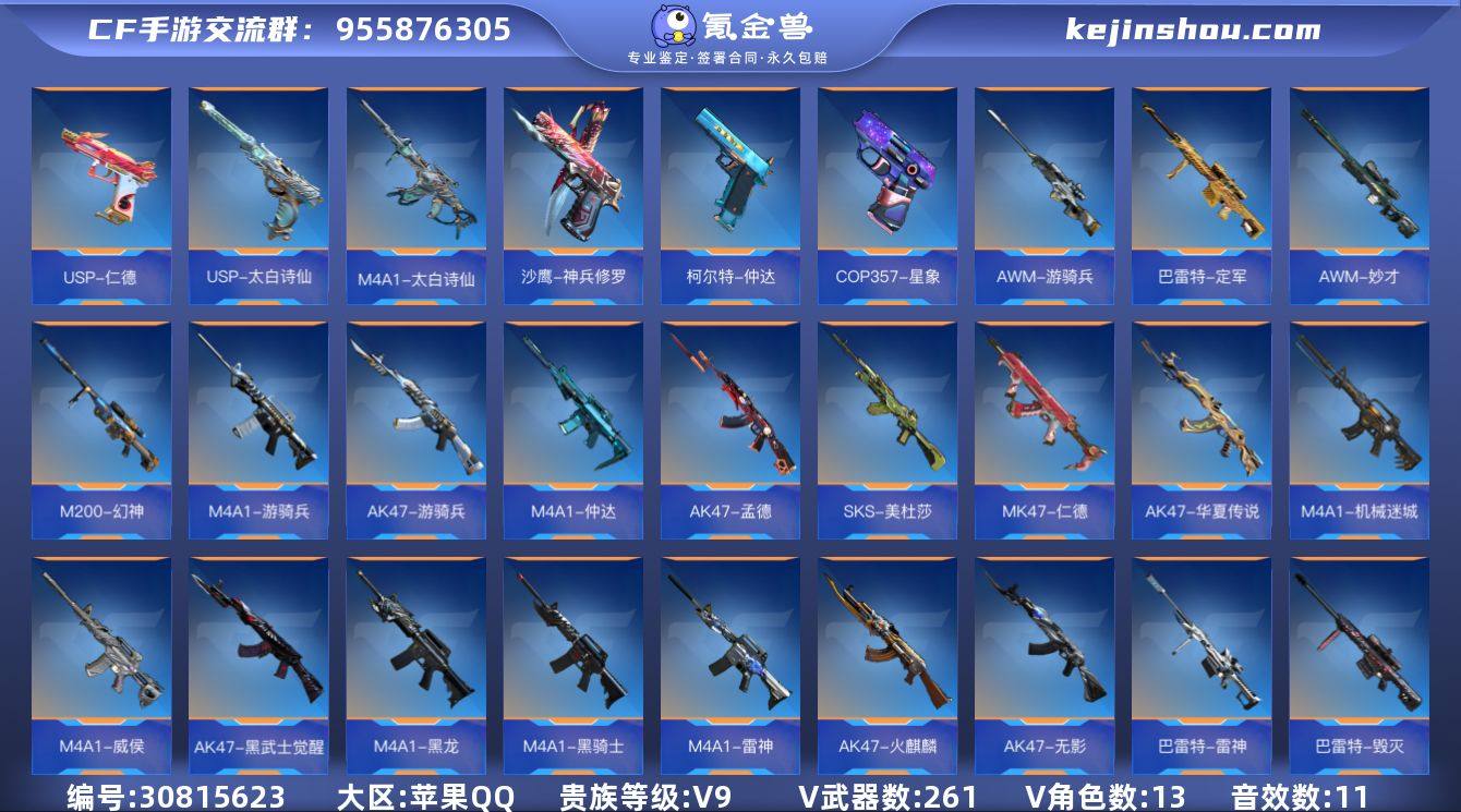 可二次 苹果QQ-V9-可排位-可转区-450V-收藏261武器-31王者-5至尊【戮至尊、影至尊、翼至尊、武至尊、烈至尊】【王者之翼-拉丝皮、王者之影-冰皮、王者之魄-拉丝皮、王者之心-冰皮、王者之戮、王者之武-冰皮、王者之神、王者之狱、王者之轮、王者之灵、王者之魂、王者之击-拉丝皮、王者之啸、王者之烈】【无影套、火麒麟套、毁灭套、M4A1-仲达-过载、M4A1-游骑兵-KZ、AK47-孟德、AK47-华夏传说-起源、M4A1-威侯-屈魔、M4A1-太白诗仙、MK47-仁德、SKS-美杜莎、81式-阿波罗、AWM-妙才、M200-幻神-战舞、柯尔特-仲达、蟒蛇-妙才-过载、COP357-星象、USP-仁德、黄金风之子】【雅典娜、樱、香香、审判者、葵、关小雨、炽天使-X、职场灵狐-赛事经理、云悠悠、孤狼、零、幽灵刀锋-觉醒、龙野】【M4A1-仲达音效卡、王者之翼音效卡、幻神音效卡、极光音效卡、火麒麟音效卡、毁灭音效卡、无影音效卡、王者之武音效卡、王者之魄音效卡】详情看图★星迈游★低价出售找回包赔