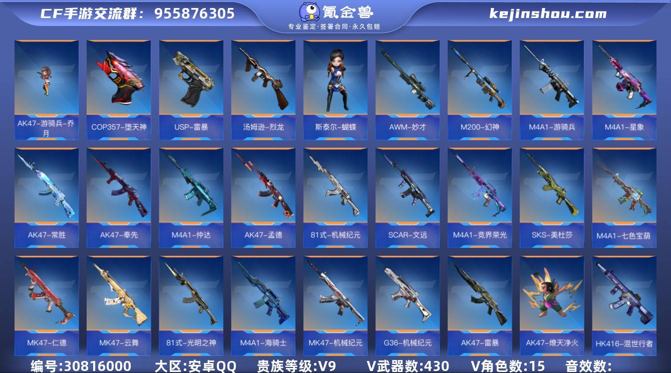 【FC-VXzBoM】安卓QQ,成人号:是,角色等级:200,实名:有修改人脸机会/实名是本人,段位:枪神,VIP等级:V9,V武器数量:430,V角色数量:15,V总数量:280,王者武器数:42,万化数量:536, 【人物角色】孙悟空,牛妹,洛克,云悠悠,蝴蝶,关小雨,海滩夜玫瑰,由乃,潜龙队,娜塔莎,樱,太阳神-曦,幽灵刀锋,大老师,堕天使,周年庆纪念赛斯,复仇者,运动宝贝兰,葵,铁骑,洛伊,萝拉,暗影,春节兰,零,夜玫瑰-2017,圣诞灵狐,刀锋-2017,审判者,曼陀罗,白狼,幻影,夜玫瑰,兰,赛斯,潘多拉,猎狐者,刀锋,奥摩,斯沃特,秦师,炽天使-X,夏日灵狐-X,云悠悠-心动起点,蝉,木兰,奥妹,蜀雪,月神,雅典娜,灵动武士,变装舞会兰,零-水下丽影,赛丝,职场灵狐-赛事经理,斯薇特, 【王者武器】王者之誉,王者之兽,M12S-雷霆王者,王者之势闪光弹,王者之势手雷,王者之心手雷,王者之影手雷,王者之兽手雷,王者之圣手雷,王者之心烟雾弹,王者之心闪光弹,王者之翼闪光弹,王者之兽闪光弹,王者之影闪光弹,王者之圣闪光弹,王者之兽烟雾弹,王者之影烟雾弹,王者之圣烟雾弹,王者之势烟雾弹,王者之翼烟雾弹,王者之心,王者之影,王者之魄,王者之戮,王者之怒,王者之光,王者之力,王者之魂,王者之轮,王者之电,王者之锋,王者之刺,王者之击,王者之烈,王者之迹,王者之痕,王者之神,王者幻神,王者之狱,王者之腾,王者之仞,王者之隐, 【至尊套装】兽至尊,怒至尊,心至尊,魄至尊,狱至尊,神至尊,王者幻神至尊套,腾至尊, 【带V枪械】王者之锋-冰霜奇迹,王者之击-冰霜奇迹,AWM-天龙-英雄战甲,王者幻神-冰霜奇迹,M200-幻神-战舞,王者之势手雷-冰霜奇迹,王者之圣手雷-冰霜奇迹,王者之翼闪光弹-冰霜奇迹,王者之心闪光弹-HeartShot,王者之翼烟雾弹-冰霜奇迹,AK47-无影-荣耀酷...