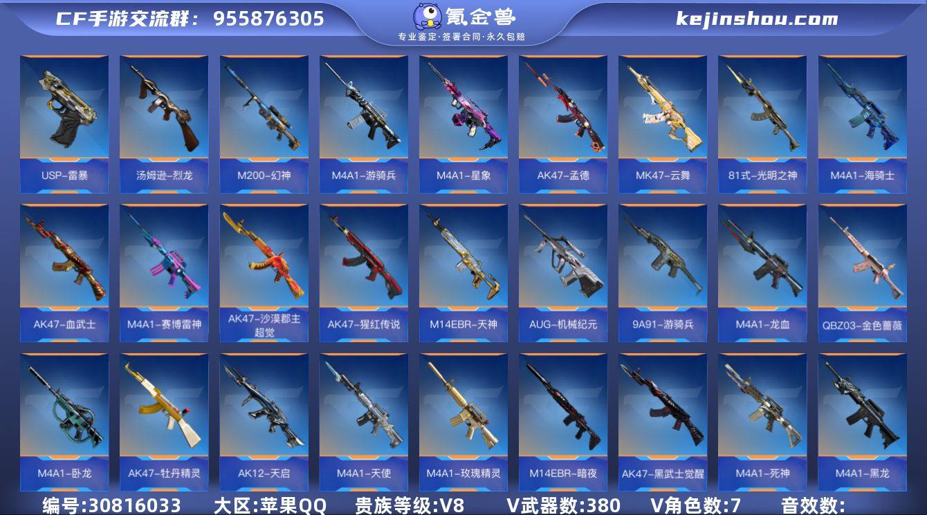 【FC-jiFufS】苹果QQ,角色等级:148,实名:有修改人脸机会/实名是本人,段位:枪皇S,VIP等级:V8,V武器数量:380,V角色数量:7,V总数量:287,王者武器数:26,万化数量:76, 【人物角色】蝴蝶,关小雨,樱,幽灵刀锋,葵,铁骑,洛伊,夏日灵狐,春节兰,曼陀罗,幻影,赛斯,潘多拉,奥摩,斯沃特,秦师,炽天使-X,武媚,云悠悠-心动起点,龙妹,奥妹,蜀雪,月神,变装舞会兰,零-水下丽影,斯薇特, 【王者武器】王者之竞手雷,蝴蝶刀-天神,唐刀-华夏传说,M12S-雷霆王者,王者之势闪光弹,王者之势手雷,王者之心手雷,王者之心烟雾弹,王者之心闪光弹,王者之翼闪光弹,王者之圣闪光弹,王者之圣烟雾弹,王者之势烟雾弹,王者之翼烟雾弹,王者之心,王者之影,王者之翼,王者之魄,王者之势,王者之怒,王者之光,王者之魂,王者之电,王者之锋,王者之迹,王者之狱, 【至尊套装】怒至尊,心至尊,魄至尊, 【带V枪械】王者之势手雷-冰霜奇迹,王者之心闪光弹-HeartShot,AK47-火麒麟-能量核心,MK5-机械纪元-蚀刻战甲,M4A1-海骑士,M4A1-赛博雷神,AK47-孟德-过载,M4A1-龙血,M4A1-星象,M4A1-卧龙,沙鹰-修罗-不屈老兵,M4A1-游骑兵,M4A1-天使,M4A1-玫瑰精灵,M4A1-死神,M4A1-黑龙,M4A1-黑骑士,M4A1-雷神,MK47-云舞,AK47-血武士,AK47-沙漠郡主-超觉,AK47-猩红传说,双管猎枪-黑骑士-暗月,AK47-孟德,M4A1-黑骑士-暗月,M4A1-死神-秘银,AK47-冰魂觉醒,AK47-牡丹精灵,AK47-黑武士觉醒,M4A1-游骑兵-紫魇,AK47-麒麟,AK47-火麒麟,AK47-无影,81式-光明之神,M4A1-雷神-千变,M14EBR-天神,M14EBR-暗夜,AUG-机械纪元,9A91-游骑兵,QBZ03-金色蔷薇,98K-血月,98K-黑骑士,AK12-天启,M200-心动次元,M200-幻神,巴雷特-安琪拉,巴雷特-雷神,巴雷特-极光,王者之影-冰霜奇迹,MR1-龙吟惊...