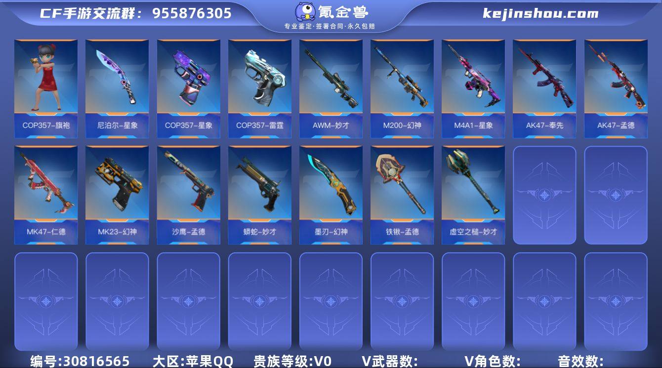 实名: 可修改 贵族等级: V0 v武器: MK47-仁德,AK47-孟德,AK47-奉先,M4A1-星象,M200-幻神,AWM-妙才,MK23-幻神,沙鹰-孟德,COP357-雷霆,蟒蛇-妙才,COP357-星象,墨刃-幻神,铁锹-孟德,虚空之槌-妙才,尼泊尔-星象,COP357-旗袍
