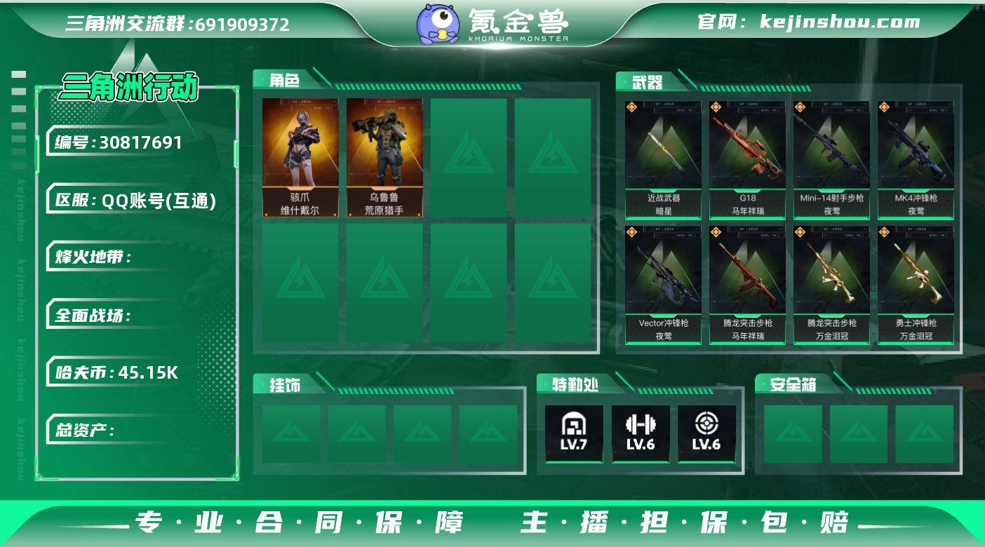 【包人脸】289M 45153K哈夫币 60-烽火等级 128-三角币|三角劵 87级通行证 50-战场等级 【近战武器】 暗星 黑鹰 【特战干员外观】 骇爪-维什戴尔 乌鲁鲁-荒原猎手 【套装】 暗星套 维什戴尔套 【典藏枪皮】 M7战斗步枪-棱镜攻势S2(优品C) 【传说枪皮】 腾龙突击步枪-捞点薯条 AWM狙击步枪-捞点薯条 93R-捞点薯条 R93狙击步枪-维什戴尔 S【勾选了部分装备-详情看图-】平台安心购店铺/保证金商家/10分钟左右发货完成,累计出售账号1万+/安全有保障!喜欢直接下单即可/24小时在线!!