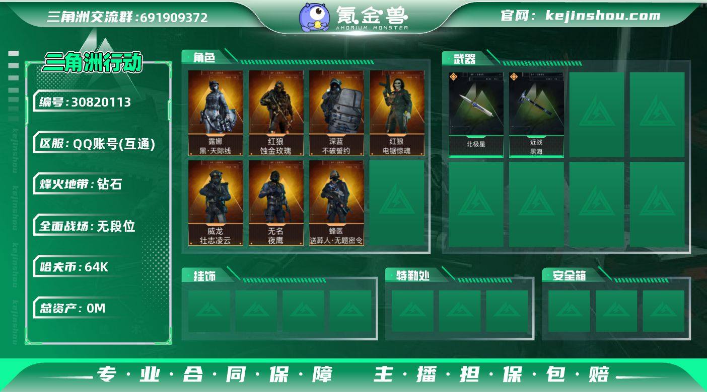 SJ181【2红皮5金皮干员外观-2刀皮-北极星 黑海 黑-天际线 蚀金玫瑰】黑-天际线 蚀金玫瑰 烽火等级60 总资产17M 哈夫币64K Q区三端互通 烽火段位钻石V【刀皮】北极星 黑海 【干员皮肤】露娜-黑-天际线 红狼-蚀金玫瑰 红狼-电锯惊魂 深蓝-不破誓约 蜂医-送葬人-无题密令 威龙-壮志凌云 无名-夜鹰 【枪皮】 M4A1突击步枪-蚀金玫瑰 M4A1突击步枪-阿米娅 ASh-12战斗步枪-鹅鹅杀 M16A4突击步枪-狩猎时刻 AK12突击步枪-夜鹰 SCAR-H战斗步枪-启航 SCAR-H战斗步枪-铁艺苍穹 G3战斗步枪-骑士 G3战斗步枪=狩猎时刻 CAR-15突击步枪-阿米娅 腾龙突击步枪-捞点薯条 Vector冲锋枪-狩猎时刻 勇士冲锋枪-能天使-午夜邮差 QCQ171冲锋枪-鹅鸭杀 725双管霰弹枪-送葬人-无题密令 M250通用机枪-骑士之心 QJB201轻机枪-鹅鸭杀 SR-25射手步枪-水墨云图 AWM狙击步枪-捞点薯条 93R-捞点薯条 复合弓-黑-天际线