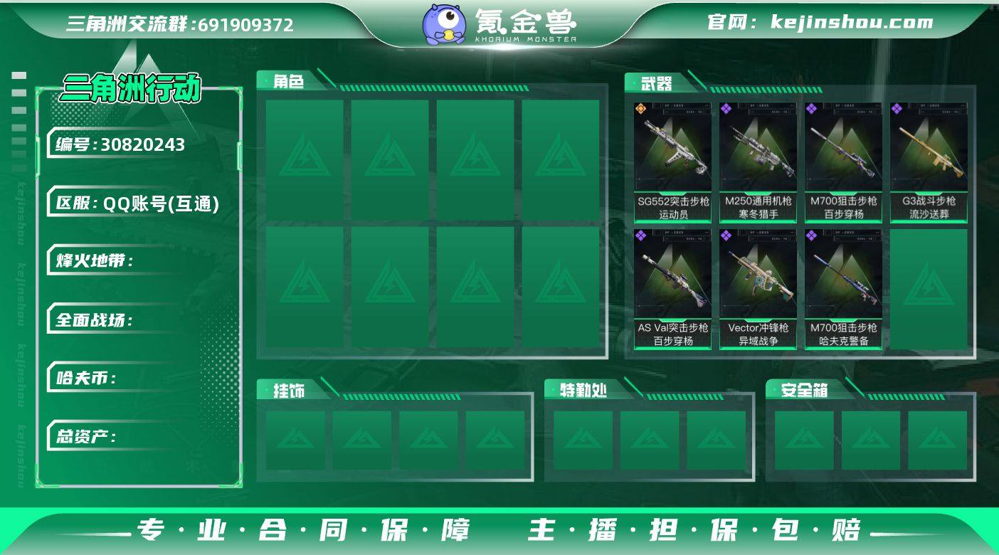 实名: 不可修改 传说武器皮肤: SG552突击步枪-运动员 史诗武器皮肤: G3战斗步枪-流沙送葬,AS Val突击步枪-百步穿杨,M700狙击步枪-百步穿杨,Vector冲锋枪-异域战争,M700狙击步枪-哈夫克警备,M250通用机枪-寒冬猎手