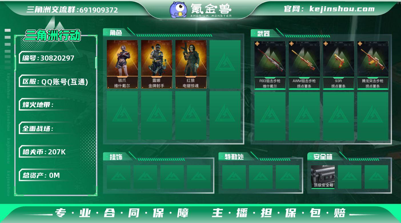 【维什戴尔全套+红狼-电锯惊魂套+S7赛季9格保险箱+总资产334M(流动305.3M+不动28.7M)+纯币207M+特勤等级(仓库8体力6负重6)+烽火60级+S7赛季皮肤+捞点薯条捆绑包+40发AW+非洲之心】yx3389