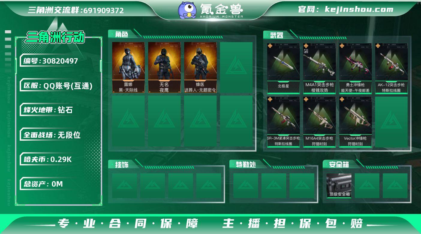 tx1045 总资产712M 烽火等级60级 M4A1-棱镜攻势(优品C) 露娜-黑天际线捆绑包 北极星单刀皮 S4S5赛季通行证 无名-夜鹰 蜂医-送葬人 S5赛季3x3箱子 特勤处满级(仓库9级) 部门高等级 非洲之心 收藏室多大红 仓库多大红 超多咖啡豆 KD超低 291M纯币 纯绿玩 (0违规记录)