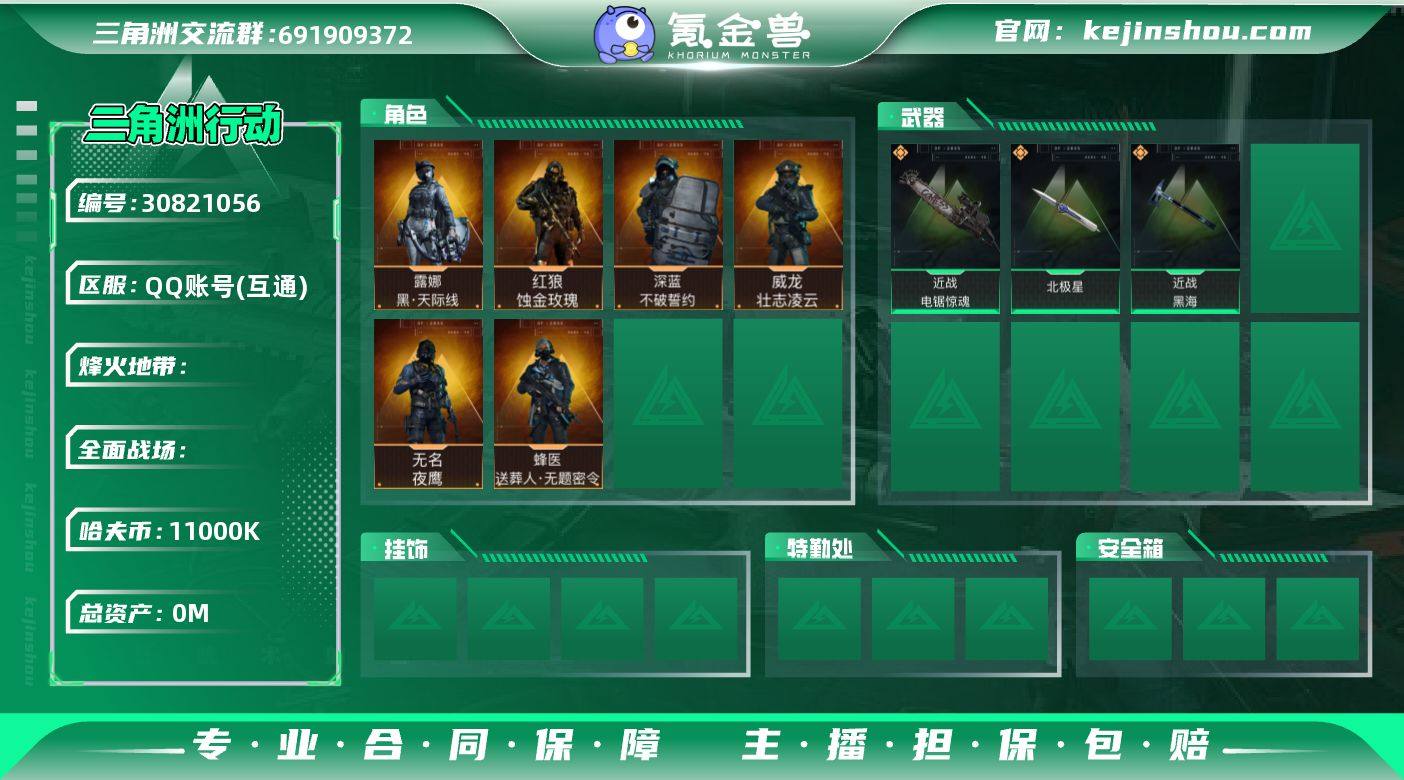 yc8593/QQ区/总资产318M/哈夫币1100W/仓库十级+体力七级/【干员皮肤:红狼-蚀金玫瑰/露娜-黑天际线/威龙-壮志凌云/蜂医-送葬人/无名-夜鹰/深蓝-不破誓约/】【刀皮:北极星/黑海/电锯惊魂】