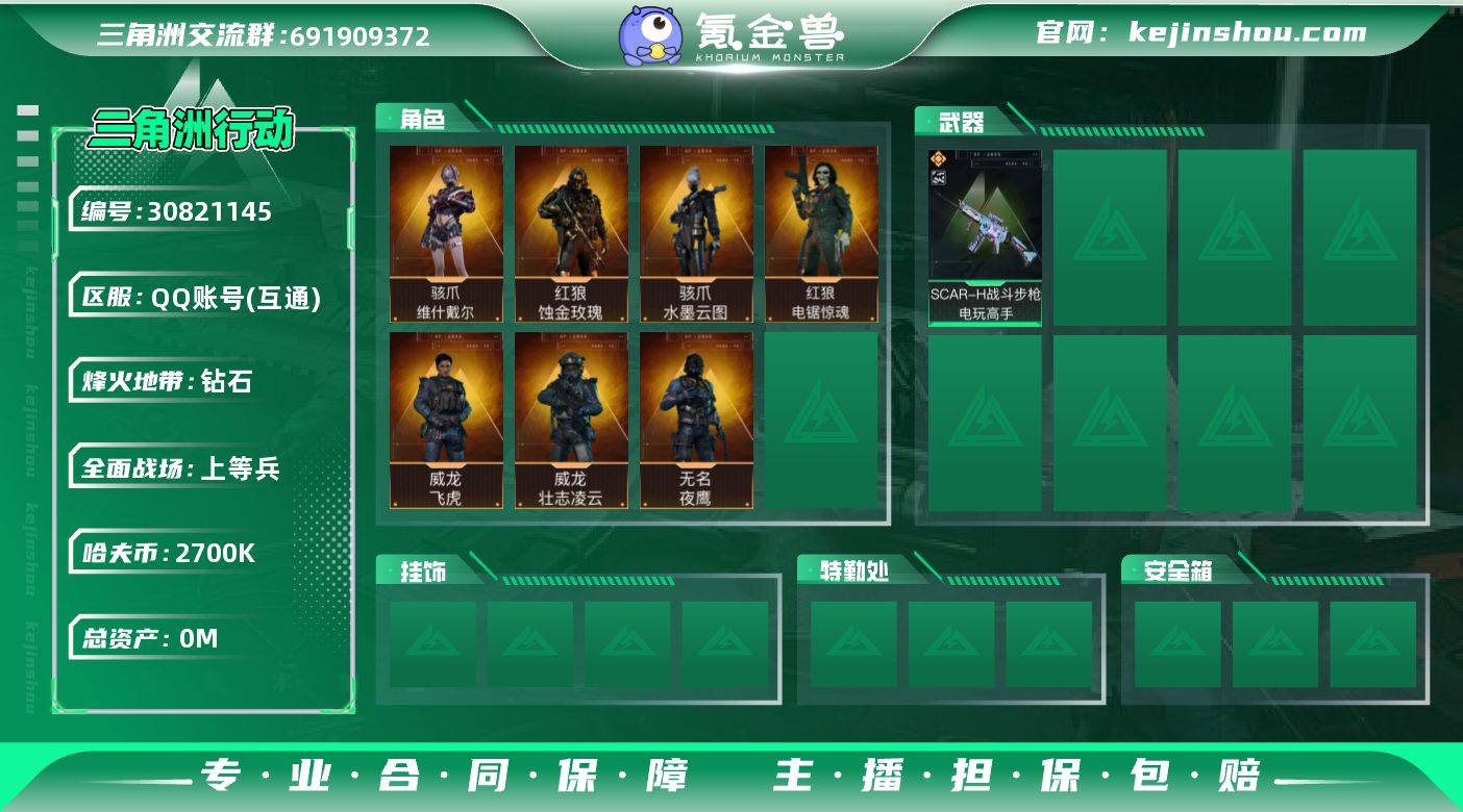 ABC9376/QQ区/可二次/【总资产:118M+近战武器-影锋+近战武器-黑海+SCAR-H战斗步枪-电玩高手(优品B)+骇爪维什戴尔+骇爪水墨云图+红狼蚀金玫瑰+威龙飞虎+威龙壮志凌云+无名夜鹰+红狼电锯惊魂】哈夫币:270W,武器皮肤142;烽火60级:钻石Ⅲ,战场:上等兵Ⅱ,【安全箱】基础安全箱;【特勤处等级】仓库LV.8,靶场LV.5,训练中心LV.6,收藏室LV.0,潜水中心LV.0;【捆绑包6】影锋捆绑包,黑海捆绑包,维什戴尔捆绑包,蚀金玫瑰捆绑包,飞虎捆绑包,电锯惊魂干员捆绑包;【干员皮肤7】骇爪维什戴尔,骇爪水墨云图,红狼蚀金玫瑰,威龙飞虎,威龙壮志凌云,无名夜鹰,红狼电锯惊魂;【典藏皮肤】SCAR-H战斗步枪-电玩高手(优品B);【近战皮肤】近战武器-影锋,近战武器-黑海,近战武器-黑鹰;【步枪皮肤】SCAR-H战斗步枪-电玩高手,M4A1突击步枪-阿米娅,M4A1突击步枪-蚀金玫瑰,AK-12突击步枪-夜鹰,SCAR-H战斗步枪-启航,SCAR-H战斗步枪-水墨云图,SCAR-H战斗步枪-铁艺苍穹,CAR-15突击步枪-阿米娅,KC17突击步枪-电锯惊魂,M4A1突击步枪-特勤执行,AKM突击步枪-林中猎手,QBZ95-1突击步枪-曙光,QBZ95-1突击步枪-ACE,ASh-12战斗步枪-守夜人,AUG突击步枪-特勤执行,SG552突击步枪-尖端治疗,G3战斗步枪-战场英杰,PTR-32突击步枪-ACE,ASVal突击步枪-尖端治疗,腾龙突击步枪-猎鳄行动;