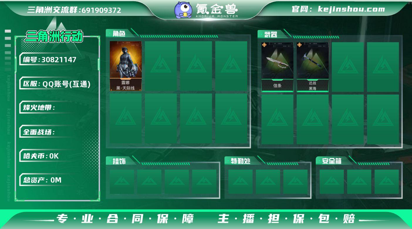 实名: 可修改 总资产: 177 哈夫币: 1 传说武器皮肤: 近战-黑海,近战-信条 干员外观: 露娜-黑·天际线
