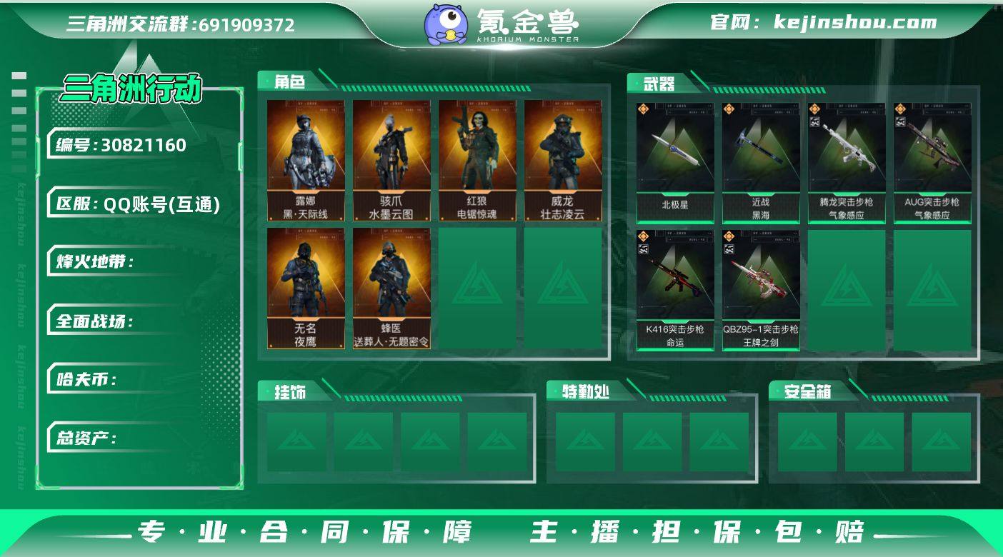 ABC9103/QQ区/可二次/钱包注销/【总资产:225.1M+近战北极星黑海+骇爪水墨云图+露娜黑天际线+蜂医送葬人无题密令+威龙壮志凌云+无名夜鹰+红狼电锯惊魂+深蓝不破誓约+K416突击步枪-命运(优品C)+QBZ95-1突击步枪-王牌之剑(优品C)+腾龙突击步枪-气象感应(优品C)+AUG突击步枪-气象感应(优品C)】哈夫币:948W,武器皮肤275;烽火60级:钻石Ⅰ,战场:军士长Ⅱ,【安全箱】基础安全箱;【特勤处等级】仓库LV.8,靶场LV.6,训练中心LV.7,收藏室LV.0,潜水中心LV.1;【捆绑包10】黑海捆绑包,北极星捆绑包,鹅鸭杀捆绑包,黑天际线捆绑包,电锯惊魂干员捆绑包,特斯拉线圈捆绑包,捞点薯条捆绑包,曙光捆绑包,蝮蛇捆绑包,禁卫捆绑包;【干员皮肤7】骇爪水墨云图,露娜黑天际线,蜂医送葬人无题密令,威龙壮志凌云,无名夜鹰,红狼电锯惊魂,深蓝不破誓约;【典藏皮肤】K416突击步枪-命运(优品C),QBZ95-1突击步枪-王牌之剑(优品C),腾龙突击步枪-气象感应(优品C),AUG突击步枪-气象感应(优品C);【近战皮肤】近战武器-黑海,近战武器-北极星,近战武器-黑鹰;【步枪皮肤】K416突击步枪-命运,QBZ95-1突击步枪-王牌之剑,腾龙突击步枪-气象感应,AUG突击步枪-气象感应,M4A1突击步枪-阿米娅,ASh-12战斗步枪-鹅鸭杀,AK-12突击步枪-夜鹰,AK-12突击步枪-特斯拉线圈,SCAR-H战斗步枪-启航,SCAR-H战斗步枪-水墨云图,SCAR-H战斗步枪-铁艺苍穹,G3战斗步枪-骑士,CAR-15突击步枪-阿米娅,CAR-15突击步枪-黑鹰坠落,腾龙突击步枪-捞点薯条,K437突击步枪-北极星,KC17突击步枪-电锯惊魂,M4A1突击步枪-特勤执行,AKM突击步枪-林中猎手,QBZ95-1突击步枪-曙光,QBZ95-1突击步枪-ACE,ASh-12战斗步枪-守夜人,ASh-12战斗步枪-无极限,M16A4突击步枪-竞赛选手,AUG突击步枪-战术迷彩,AUG突击步枪-蝮蛇,AUG突击...