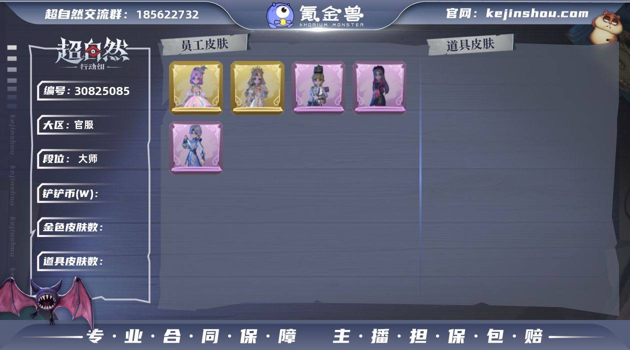 超自然2金8紫2魔盒薇薇安情号 GX1608 金皮2;紫皮8;道具皮18;皮肤:小黄-遗失的童话,薇薇安-圣光之谕,爱丽丝-丝缕哀歌,零-青云逸歌,小黄-霓裳踏雪,逍遥-绣春逍影,莉莉-除妖小师妹,巫铃儿-素影瑶光,薇薇安-白光莹,薇薇安-黑月挽歌;道具:摸金符-祝祷词,短管猎枪-赞萌露比水枪,铲子-卡皮巴拉小黄豚铲,腰包-绯红柴郡猫,摸金符-紫霄,夜视仪-金丝眼镜,铲子-龙鳞,刺刀-碧络琅环,音响-鸣沙鼓,桃木剑-永眠曲,黄牛能量饮料-青玉抱丹,刺刀-小鲨匕首,急救包-蔷薇物语,额外的背包-飞花令,桃木剑-最后的独角兽,腰包-宝剑八,转轮手枪-新星时代,长鞭-飞天绫;饰品:头饰-嘻嘻头套,头饰-炙热烧烤,头饰-卑微头套,头饰-萨卡班甲鱼头套,头饰-烈焰红唇头套,头饰-鳄霸天头套,头饰-滑稽头套,头饰-火爆了头套,头饰-鱼头怪头套,头饰-大葱明头套,头饰-小财神豚豚头套,头饰-驼半仙头套,头饰-面具马头套,头饰-小狗蛇点点头套,头饰-哈士奇头套,头饰-呆滞头套,头饰-粽小宝头套,头饰-像素朋克墨镜,头饰-后室幸存者头套,挂饰-小鲨包包,挂饰-钗头凤,挂饰-天使消失的年代,背饰-天使的呼唤,背饰-绒团小狐狸,背饰-蝶恋花;动作:动作-鹏友摇,动作-知世摇,动作-心跳摇,动作-luvaboy,动作-星奇摇,动作-刀马舞,动作-小雨摇,动作-KT猫摇,动作-舞台中心,动作-DL摇,动作-要糖,动作-山楂树之舞,动作-抬手,动作-举牌;工牌背景:工牌背景-卷珠帘,工牌背景-圣光之誓,工牌背景-心同野鹤,工牌背景-蓝海奇遇,工牌背景-童话扉页,工牌背景-佛系小豚,工牌背景-雷霆轩,工牌背景-舞台终演;工牌动作:工牌动作-元气剪刀手,工牌动作-盛气凌人,工牌动作-虔诚之姿;员工:薇薇安,爱德华,阿念,巫铃儿,零,兰,爱丽丝,莉莉,小满,艾伦,逍遥,小黄;累充1300元;铲铲币93.7万;金砖0;段位:超自然传说133;魔盒等级:1
