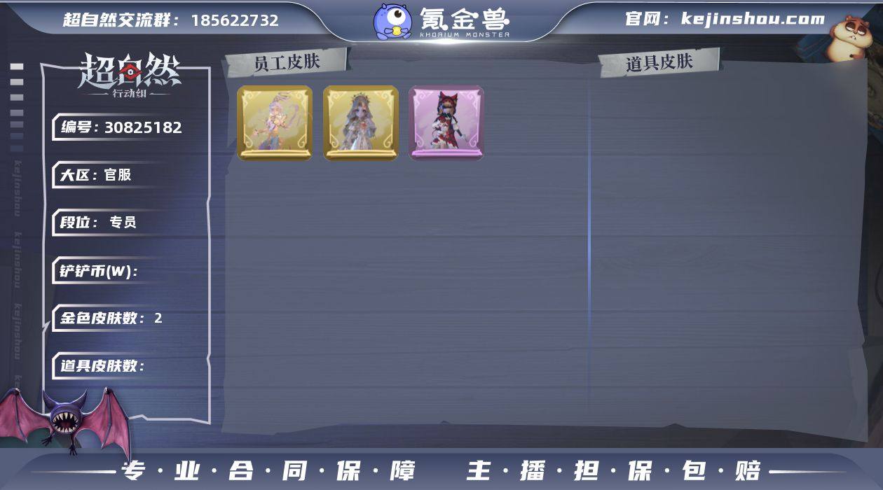 【Q1405】【段位】大师 【幻梦皮肤数量】0 【星耀限定皮肤数量】0 【金色皮肤数量】2 【紫色皮肤数量】9 【道具皮肤数量】17 【铲铲币】279w 【累充】10620金砖 【赛季魔盒】普通魔盒 【员工】小黄、爱丽丝、零、阿念、逍遥、薇薇安、巫铃儿、莉莉、艾伦、爱德华、兰、小满、临云 【金色皮肤】薇薇安-圣光之谕、巫铃儿-镜花辞 【紫色皮肤】爱丽丝-耀眼的你、爱丽丝-甜梦派对、莉莉-莓果陷阱、小黄-异色序曲、莉莉-除妖小师妹、莉莉-情公主、爱丽丝-丝缕哀歌、逍遥-绣春逍影、小黄-呱呱雨衣 【道具皮肤】桃木剑-最后的独角兽、转轮手枪-新星时代、铲子-龙鳞、音响-鸣沙鼓、摸金符-祝祷词、腰包-宝剑八、闪光弹-金戈玄铜、夜视仪-金丝眼镜、长鞭-小狗蛇点点鞭、铲子-圣心之泪、急救包-蔷薇物语、刺刀-碧络琅环、背饰-天使的呼唤、背饰-蝶恋花 【头饰】马上有钱、烛光纪念、太空鲨头套、雪墩墩头套、蒜了八、樱桃奶油布丁、惊魂南瓜头套、小财神豚豚头套、鱼头怪头套、烈焰红唇头套、大葱明头套、火爆了头套、面具马头套、哈士奇头套、萨卡班甲鱼头套、嘻嘻头套、滑稽头套、呆滞头套、卑微头套、小狗蛇点点头套、咬咬鲨头套、像素朋克墨镜、后室幸存者头套 【挂饰】未竟乐园、天使消失的年代 【动作】新年摇、luvaboy、鸳鸯戏、刀马舞、DL摇、鹏友摇、心跳摇、舞台中心、奶龙呲牙舞、带你逃跑吧、举牌、抬手、KT猫摇、失落