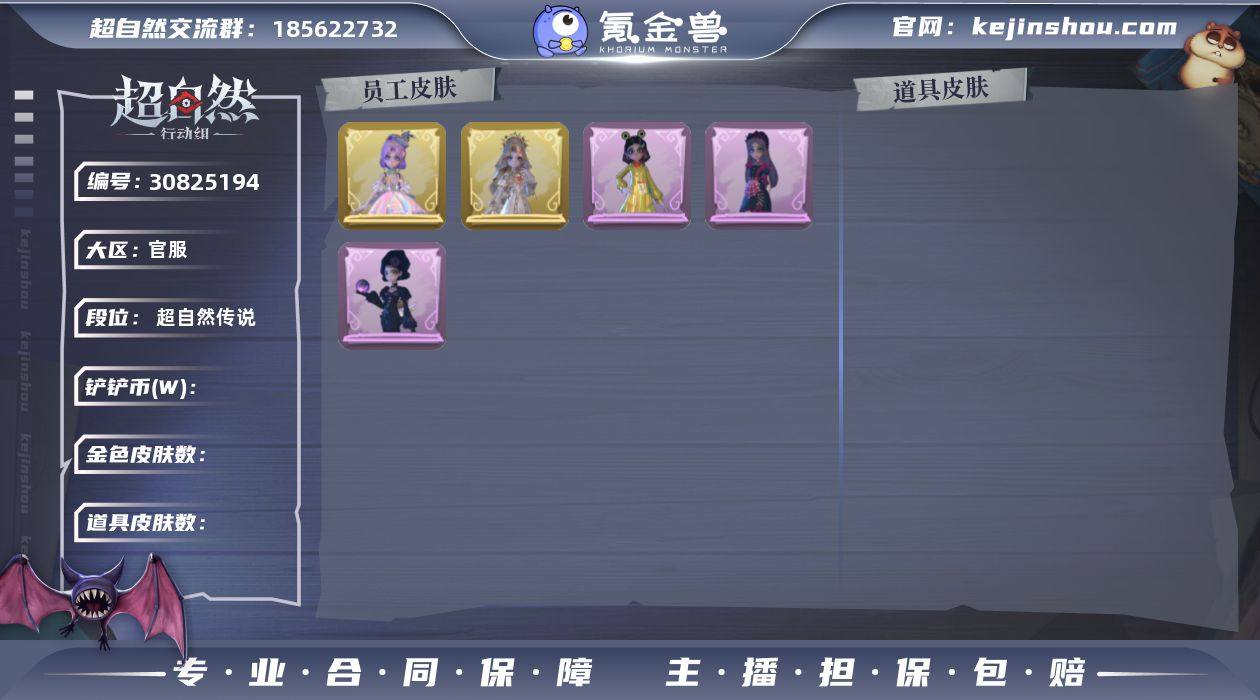 【账号已绑定信息】:密保手机 【耀世皮肤】:爱丽丝-血色中的玛丽 【典藏皮肤】:爱丽丝-耀眼的你,爱丽丝-甜梦派对,爱丽丝-丝缕哀歌,阿念-庆宴绮愿,阿念-灵昭鹿鸣,逍遥-绣春逍影,薇薇安-黑月挽歌,巫铃儿-素影瑶光,莉莉-莓果陷阱 【头饰】:蒜了八,精致露比头套,太空鲨头套,雪墩墩头套,樱桃奶油布丁,惊魂南瓜头套,大葱明头套,火爆了头套,驼半仙头套,鱼头怪头套,烈焰红唇头套,面具马头套,哈士奇头套,萨卡班甲鱼头套,卑微头套,呆滞头套,滑稽头套,嘻嘻头套 【背饰】:牛啤背包,在逃小新娘,云梦之星,兔先生的时钟 【挂饰】:九色祥鹿,未竟乐园,小小玛丽 【道具皮肤】:铲子-龙鳞,铲子-圣心之泪,传送按钮-幻宠之门,桃木剑-永眠曲,腰包-绯红柴郡猫,腰包-月下莲台,长枪-罪棘,摸金符-花落精绝,短管猎枪-赞萌露比水枪,专业手电-云端梦想计划,音响-鸣沙鼓,刺刀-碧络琅环,刺刀-赤色之刃,喷气背包-乘风溯雪,转轮手枪-新星时代,电击枪-甜蜜泡泡枪,急救包-蔷薇物语,闪光弹-金戈玄铜 【员工】:临云,兰,小满,爱德华,艾伦,莉莉,巫铃儿,薇薇安,逍遥,阿念,零,小黄,爱丽丝