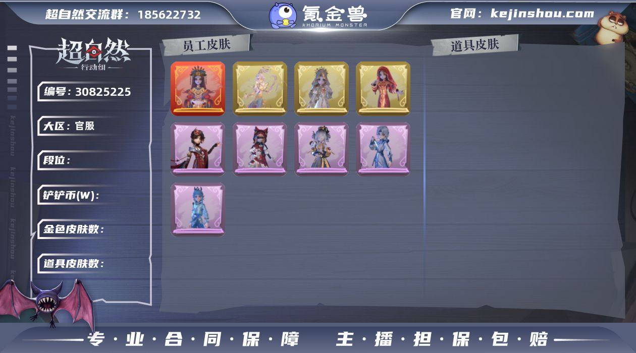 ZR370 段位:超自然传说 红色皮肤数量:1 粉色皮肤数量:0 金色皮肤数量:3 紫色皮肤数量:5 道具皮肤数量:29 铲铲币:32060000 铲铲币(单位W):3206w 外观:巫铃儿 镜生遗梦 逍遥 莲华渡 薇薇安 圣光之谕 巫铃儿 镜花辞 爱丽丝 耀眼的你 莉莉 情公主 艾伦 水王子 爱丽丝 丝缕哀歌 小黄 呱呱雨衣 道具:夜视仪 金丝眼镜 长鞭 飞天绫 腰包 宝剑八 铲子 圣心之泪 长枪 糖葫芦霸王枪 喷气背包 乘风溯雪 音响 happy猫 传送按钮 昆仑镜 急救包 蔷薇物语 铲子 龙鳞 摸金符 祝祷词 桃木剑 凤鸣九天 闪光弹 金戈玄铜 黄牛能量饮料 青玉抱丹 音响 鸣沙鼓 转轮手枪 新星时代 长鞭 小狗蛇点点鞭 短管猎枪 赞萌露比水枪 额外的背包 飞花令 摸金符 紫霄 专业手电 云端梦想计划 刺刀 小鲨匕首 葫芦 伏妖塔 腰包 惊魂娃娃 背饰 梵音莲华 背饰 云梦之星 背饰 天使的呼唤 背饰 蝶恋花 美妆:暗夜小恶魔 载具:惊奇万圣涂装 头饰:烛光纪念 蒜了八 惊魂南瓜头套 精致露比头套 小财神豚豚头套 鱼头怪头套 烈焰红唇头套 大葱明头套 火爆了头套 面具马头套 哈士奇头套 萨卡班甲鱼头套 嘻嘻头套 滑稽头套 呆滞头套 卑微头套 小狗蛇点点头套 炙热烧烤 像素朋克墨镜 后室幸存者头套 挂饰:尘封旧事 九色祥鹿 未竟乐园 小鲨包包 天使消失的年代 钗头凤 糖果守卫 晚安小熊 动作:luvaboy 鸳鸯戏 刀马舞 DL摇 鹏友摇 心跳摇 伤心摇 小雨摇 舞台中心 举牌 抬手 员工:小黄 爱丽丝 零 阿念 逍遥 薇薇安 巫铃儿 莉莉 艾伦 爱德华 兰 小满 临云 累充:27980金砖 赛季魔盒:普通魔盒