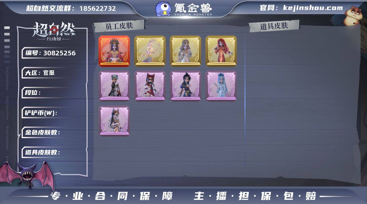 红皮1;金皮2;紫皮8;道具皮26;皮肤:巫铃儿-镜生遗梦,薇薇安-圣光之谕,巫铃儿-镜花辞,逍遥-绣春逍影,莉莉-情公主,小黄-呱呱雨衣,阿念-王子与骑士,爱丽丝-丝缕哀歌,薇薇安-黑月挽歌,逍遥-泽引山海,薇薇安-白光莹;道具:铲子-龙鳞,腰包-月下莲台,铲子-圣心之泪,音响-happy猫,除颤仪-弦外之音,电击枪-甜蜜泡泡枪,传送按钮-昆仑镜,短管猎枪-星光的裁决,急救包-蔷薇物语,喷气背包-乘风溯雪,转轮手枪-新星时代,刺刀-碧络琅环,长鞭-小狗蛇点点鞭,音响-鸣沙鼓,额外的背包-飞花令,桃木剑-凤鸣九天,桃木剑-永眠曲,黄牛能量饮料-青玉抱丹,腰包-宝剑八,摸金符-祝祷词,葫芦-伏妖塔,传送按钮-幻宠之门,夜视仪-金丝眼镜,腰包-惊魂娃娃,荧光棒-桃心-荧光棒-桃心,摸金符-花落精绝;饰品:头饰-烈焰红唇头套,头饰-炙热烧烤,头饰-驼半仙头套,头饰-滑稽头套,头饰-卑微头套,头饰-呆滞头套,头饰-鱼头怪头套,头饰-火爆了头套,头饰-萨卡班甲鱼头套,头饰-嘻嘻头套,头饰-哈士奇头套,头饰-面具马头套,头饰-大葱明头套,头饰-像素朋克墨镜,头饰-后室幸存者头套,挂饰-钗头凤,挂饰-未竟乐园,挂饰-天使消失的年代,背饰-毛球夹子,背饰-天使的呼唤,背饰-蝶恋花,背饰-绒团小狐狸;动作:动作-刀马舞,动作-鸳鸯戏,动作-小雨摇,动作-舞台中心,动作-心跳摇,动作-luvaboy,动作-鹏友摇,动作-KT猫摇,动作-山楂树之舞,动作-举牌,动作-律动迪斯科,动作-抬手;工牌背景:工牌背景-卷珠帘,工牌背景-情语塔,工牌背景-圣光之誓,工牌背景-蓝海奇遇,工牌背景-花蕾城堡,工牌背景-心同野鹤;工牌动作:工牌动作-虔诚之姿,工牌动作-净禅;员工:薇薇安,爱丽丝,阿念,零,爱德华,小黄,艾伦,逍遥,莉莉,兰,巫铃儿;累充1624元;铲铲币369.1万;金砖26;段位:超自然传说259;魔盒等级:1; 【账号已绑定信息】:密保手机