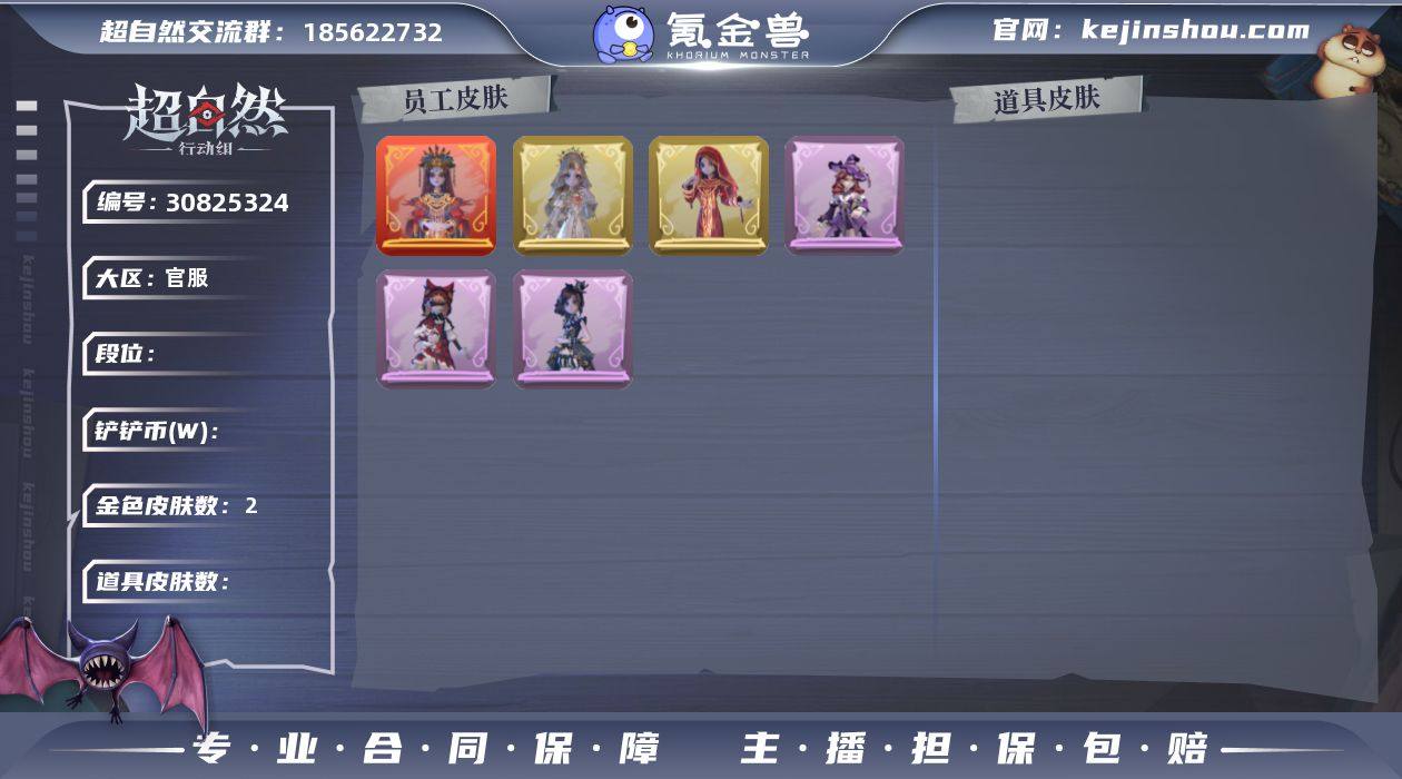 红色皮肤数量: 1 金色皮肤数量: 2 紫色皮肤数量: 16 道具皮肤数量: 23 段位: 专员 外观: 镜生遗梦,圣光之谕,镜花辞,王子与骑士,冰公主,瑞羽衔春,丝缕哀歌,青云逸歌,素影瑶光,泽引山海,黑月挽歌,罗丽,情公主,毛球夹子,兔先生的时钟,天使的呼唤,在逃小新娘,蝶恋花,小鲨包包,天使消失的年代,钗头凤,呱呱雨衣,绣春逍影,绒团小狐狸,小小白光莹,除妖小师妹,莓果陷阱,班卓琴,樱桃奶油布丁,雪墩墩头套,太空鲨头套,子夜证词,耀眼的你,庆宴绮愿,烛光纪念,牛啤背包