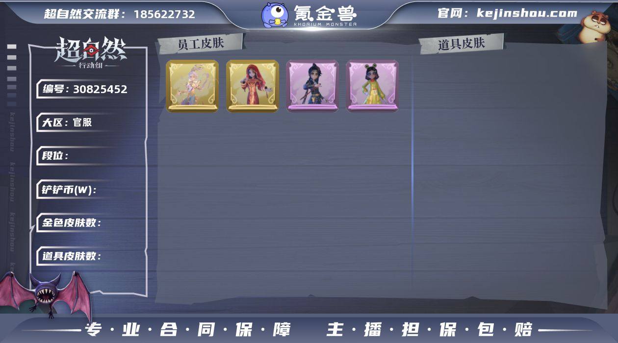 金皮1;紫皮13;道具皮15;皮肤:零-渡鸦公爵,爱丽丝-耀眼的你,逍遥-绣春逍影,莉莉-莓果陷阱,爱丽丝-瑞羽衔春,爱丽丝-丝缕哀歌,巫铃儿-素影瑶光,莉莉-除妖小师妹,小黄-霓裳踏雪,阿念-庆宴绮愿,爱丽丝-甜梦派对,小黄-呱呱雨衣,薇薇安-白光莹,薇薇安-黑月挽歌;道具:音响-鸣沙鼓,闪光弹-金戈玄铜,铲子-赞萌波板糖,铲子-撒拉弗的祷告,急救包-蔷薇物语,刺刀-碧络琅环,桃木剑-最后的独角兽,转轮手枪-新星时代,音响-咏叹调,长枪-罪棘,桃木剑-永眠曲,摸金符-紫霄,传送按钮-浮生一梦,铲子-卡皮巴拉小黄豚铲,专业手电-云端梦想计划;美妆:美妆-暗夜小恶魔;饰品:头饰-萨卡班甲鱼头套,头饰-鱼头怪头套,头饰-哈士奇头套,头饰-烈焰红唇头套,头饰-卑微头套,头饰-火爆了头套,头饰-滑稽头套,头饰-烛光纪念,头饰-惊魂南瓜头套,头饰-鳄霸天头套,头饰-驼半仙头套,头饰-嘻嘻头套,头饰-面具马头套,头饰-炙热烧烤,头饰-呆滞头套,头饰-太空鲨头套,头饰-园丁鲨鲨头套,头饰-雪墩墩头套,头饰-大葱明头套,头饰-樱桃奶油布丁,头饰-饺饺者头套,头饰-马上有钱,头饰-蒜了八,头饰-粽小宝头套,头饰-像素朋克墨镜,头饰-后室幸存者头套,挂饰-拂云仙,挂饰-未竟乐园,挂饰-糖果守卫,挂饰-钗头凤,挂饰-天使消失的年代,挂饰-晚安小熊,挂饰-小小玛丽,背饰-绒团小狐狸,背饰-云梦之星,背饰-天使的呼唤,背饰-潮汐小海兔,背饰-牛啤背包;动作:动作-新年摇,动作-luvaboy,动作-舞台中心,动作-sugar摇,动作-抖肩舞,动作-带你逃跑吧,动作-KT猫摇,动作-要糖,动作-抬手,动作-举牌,动作-山楂树之舞,动作-拜年;工牌背景:工牌背景-珊瑚海,工牌背景-点点萌伴,工牌背景-蓝海奇遇,工牌背景-童话扉页,工牌背景-流金照庭,工牌背景-鸢尾花,工牌背景-情语塔;工牌动作:工牌动作-净禅,工牌动作-虔诚之姿,工牌动作-盛气凌人,工牌动作-春色盈怀;员工:爱德华,临云,兰,艾伦,...