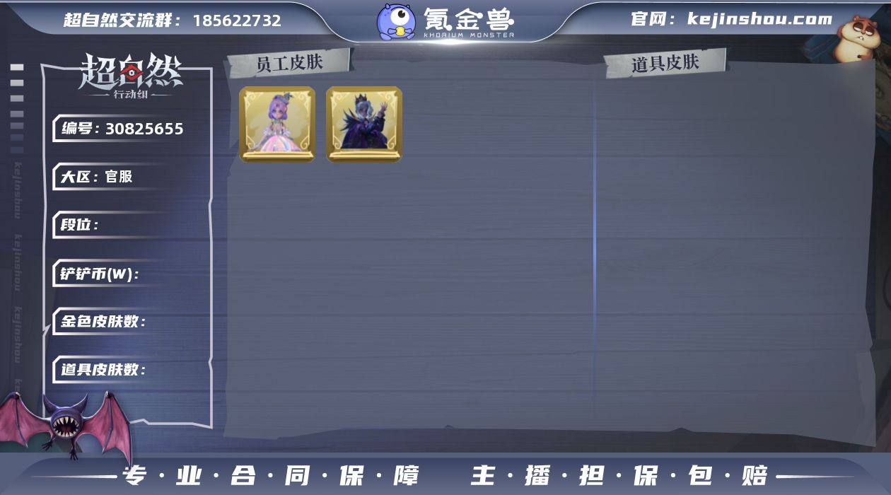 【Q1446】 【段位】超自然传说 【幻梦皮肤数量】0 【星耀限定皮肤数量】0 【金色皮肤数量】0 【紫色皮肤数量】15 【道具皮肤数量】21 【铲铲币】433w 【累充】57800金砖 【赛季魔盒】普通魔盒 【员工】小黄、爱丽丝、零、阿念、逍遥、薇薇安、巫铃儿、莉莉、艾伦、爱德华、兰、小满、临云 【紫色皮肤】艾伦-黎明猎手、阿念-庆宴绮愿、爱丽丝-耀眼的你、兰-千夜星谕、薇薇安-仙锋小姐、爱丽丝-甜梦派对、莉莉-莓果陷阱、莉莉-除妖小师妹、阿念-王子与骑士、莉莉-情公主、薇薇安-白光莹、巫铃儿-素影瑶光、爱丽丝-丝缕哀歌、逍遥-绣春逍影、小黄-呱呱雨衣 【道具皮肤】急救包-蔷薇物语、铲子-圣心之泪、长鞭-缚誓之锁、音响-happy猫、转轮手枪-新星时代、刺刀-碧络琅环、音响-鸣沙鼓、电击枪-权杖的许诺、摸金符-花落精绝、电击枪-甜蜜泡泡枪、腰包-私藏的银河、闪光弹-金戈玄铜、短管猎枪-星光的裁决、喷气背包-乘风溯雪、铲子-赞萌波板糖、背饰-蝶恋花、背饰-毛球夹子、背饰-小小情公主 【头饰】马上有钱、腊肠扭扭、烛光纪念、太空鲨头套、雪墩墩头套、蒜了八、樱桃奶油布丁、惊魂南瓜头套、小财神豚豚头套、鱼头怪头套、烈焰红唇头套、大葱明头套、火爆了头套、面具马头套、哈士奇头套、萨卡班甲鱼头套、嘻嘻头套、滑稽头套、呆滞头套、卑微头套、咬咬鲨头套、炙热烧烤、像素朋克墨镜、后室幸存者头套 【挂饰】尘封旧事、未竟乐园、天使消失的年代、钗头凤 【动作】新年摇、luvaboy、卡点舞、小雨摇、舞台中心、拜年、蝴蝶步、带你逃跑吧、律动迪斯科、举牌、抬手、KT猫摇