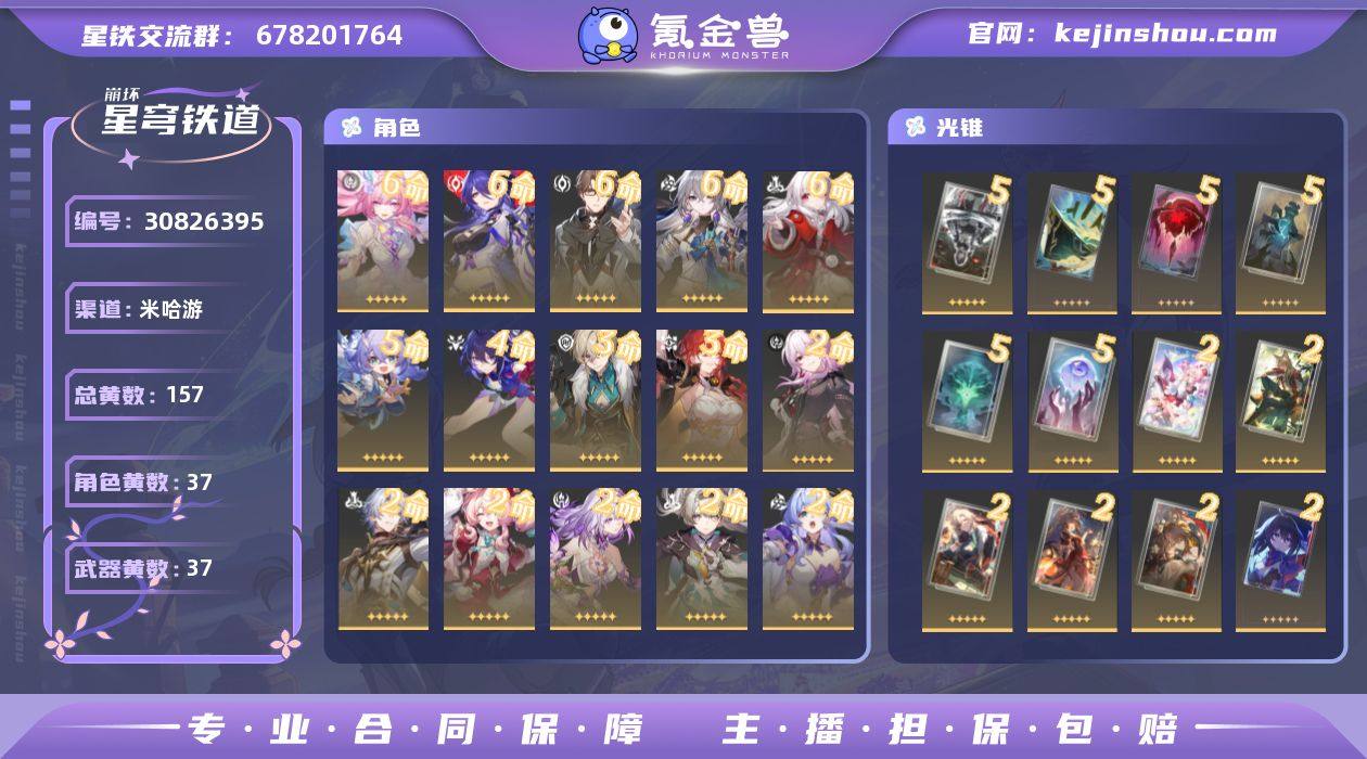 开拓者性别:女 总黄数:157 星轨专票:5 五星角色数:37 6命昔涟,6命黄泉,6命瓦尔特,6命布洛妮娅,6命克拉拉,5命白露,4命希儿,3命砂金,3命姬子,2命长夜月,2命白厄,2命风堇,2命遐蝶,2命流萤,2命知更鸟,2命花火,2命阮·梅,2命符玄,1命刻律德菈,1命缇宝,1命灵砂,1命椒丘,1命托帕&账账,1命镜流,1命刃,0命丹恒·腾荒,0命Archer,0命大黑塔,0命真理医生,0命银枝,0命藿藿,0命丹恒·饮月,0命卡芙卡,0命罗刹,0命银狼,0命杰帕德,0命彦卿 冬去煦至 五星光锥数:37 5精行于流逝的岸,5精不息的演算,5精孤独的疗愈,5精记一位星神的陨落,5精记忆永不落幕,5精星海巡航,2精愿虹光永驻天空,2精那无数个春天,2精命运从未公平,2精游戏尘寰,2精镜中故我,2精于夜色中,2精银河铁道之夜,2精无可取代的东西,2精时节不居,2精如泥酣眠,1精爱如此刻永恒,1精纵然山河万程,1精致长夜的星光,1精金血铭刻的时代,1精理想燃烧的地狱,1精黎明恰如此燃烧,1精谎言在风中飘扬,1精让告别,更美一些,1精如果时间是一朵花,1精梦应归于何处,1精夜色流光溢彩,1精纯粹思维的洗礼,1精惊魂夜,1精此身为剑,1精她已闭上双眼,1精比阳光更明亮的,1精到不了的彼岸,1精棺的回响,1精以世界之名,1精但战斗还未结束 邮箱状态:未绑定 卖家说:未绑定邮箱 角色池垫73抽,光锥池垫50抽,号上还有70多抽,三期绝境0t,有累充名片和昔涟弓皮,记忆队白厄队38词条左右大毕业