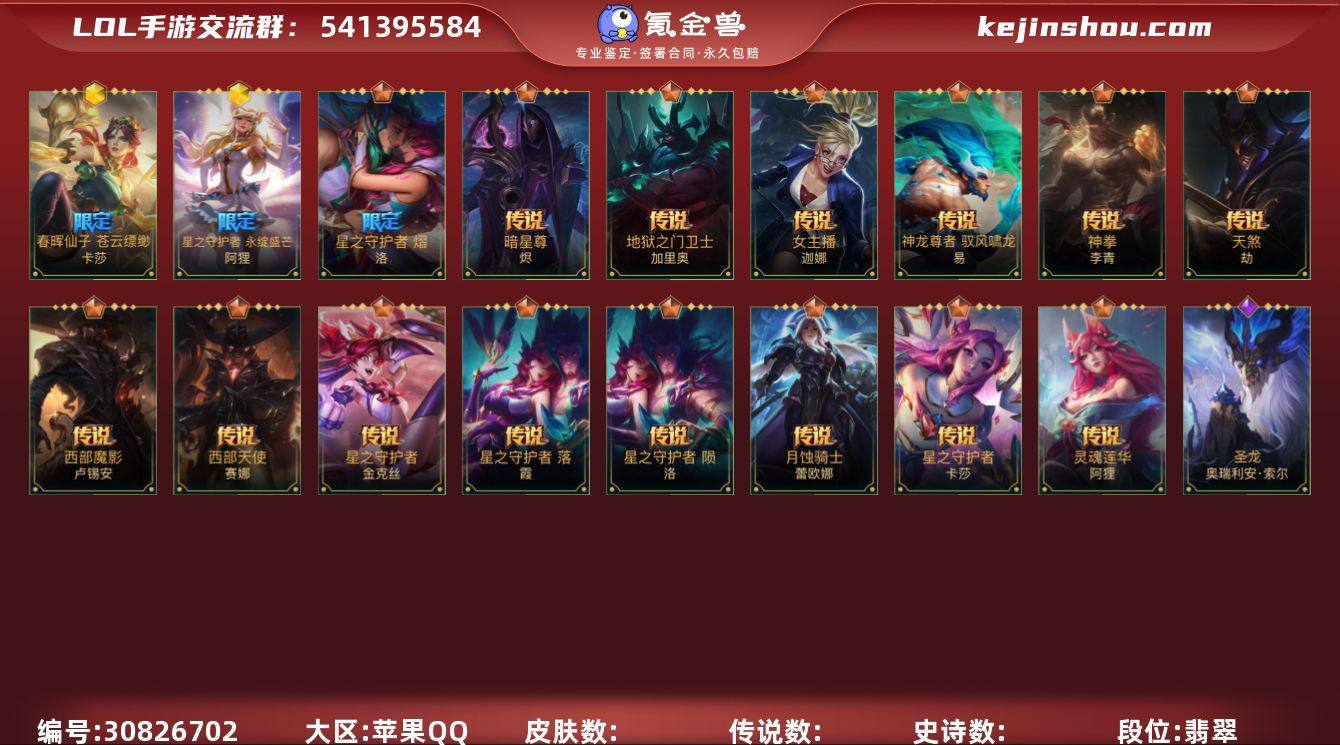 苹果QQ,实名情况:可二次实名,等级:234,段位:流光翡翠, 【神话皮】春晖仙子 苍云缥缈 卡莎,星之守护者 阿狸, 【传说皮肤】神拳 李青,星之守护者 金克丝,暗星尊 烬,地狱之门卫士 加里奥,女主播 迦娜,神龙尊者 驭风啸龙 易,西部魔影 卢锡安,西部天使 赛娜,天煞 劫,星之守护者 陨 洛,星之守护者 落 霞,月蚀骑士 蕾欧娜,星之守护者 永绽盛芒 阿狸,灵魂莲华 阿狸,星之守护者 卡莎, 【史诗皮肤】神龙尊者 圣龙 李青,