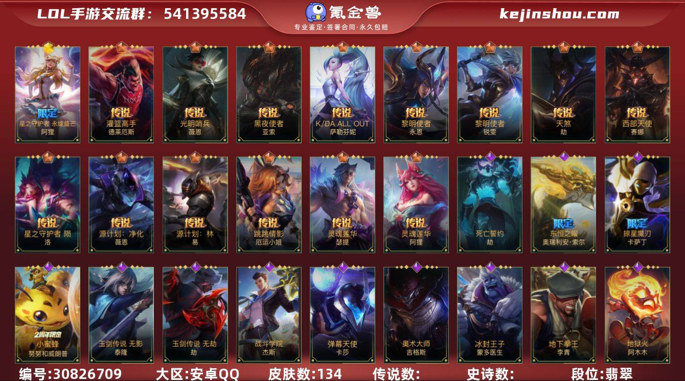 实名情况:不可二次实名,131英雄-134皮肤,龙冕神策 吉格斯,星之守护者 阿狸,K/DA ALL OUT 萨勒芬妮,西部天使 赛娜,天煞 劫,黎明使者 锐雯,灌篮高手 德莱厄斯,源计划:林 易,黎明使者 永恩,灵魂莲华 瑟提,星之守护者 陨 洛,灵魂莲华 阿狸,黑夜使者 亚索,跳跳倩影 厄运小姐,光明哨兵 薇恩,源计划:净化 薇恩,腥红之月 亚托克斯,霸天剑魔 亚托克斯,魅惑女巫 薇古丝,玉剑