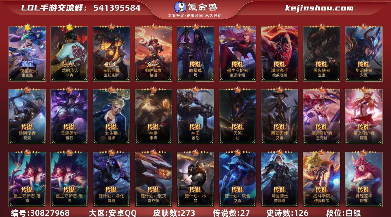 皮肤数:273 典藏皮肤数量:0 神话皮肤数量:2 传说皮肤数量:27 史诗皮肤数量:126 夜星流火 金克丝,龙的传人 段位:白银