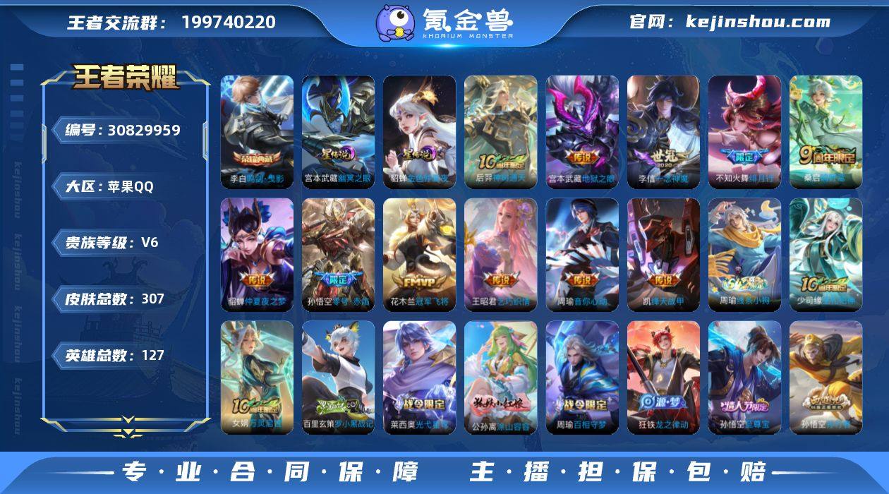 贵族等级:V6 典藏皮肤数:1 珍品无双皮肤数:0 无双皮肤数:0 珍品传说皮肤数:0 传说皮肤数:11 史诗皮肤数:85 皮肤数:307 英雄数:127 段位:星耀