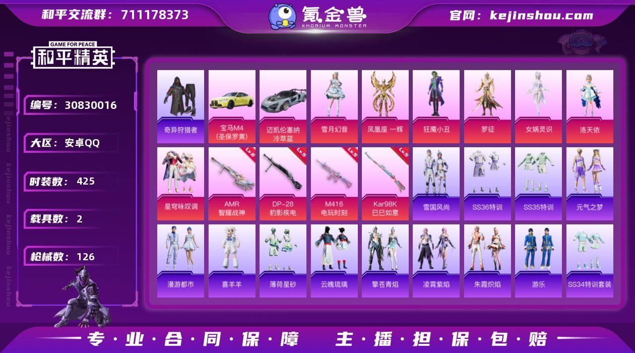 热力值:42254 载具数:2 时装数:425 枪械数:126 战备数:121 游戏等级:62 卓越印记:6 传奇印记:0 绝世印记:0 凤凰座 一辉,狂魇小丑,洛天依,罗征,女娲灵识,星穹咏叹调,雪月幻音 六级AMR-智耀战神,五级DP-28-豹影疾电,五级Kar98K-巳巳如意,五级M416-电玩时刻 宝马M4(圣保罗黄),迈凯伦塞纳(冷萃蓝) 炫彩糖果降落伞,魔童闹海 敖丙降落伞,提桶跑路飞行器,喜羊羊与灰太狼降落伞,繁龙极客飞行器,镜光幻境飞行翼,萌物绒绒飞行器,霓虹漫游飞行器,初号机 觉醒Ver.降落伞,创世·救赎降落伞,第五大道降落伞,繁龙极客降落伞,绯穹魔姬降落伞,鬼刀降落伞,歌者泠鸢降落伞,辉羽雀灵降落伞,精灵梦叶罗丽降落伞,奇迹舞步降落伞,齐天大圣降落伞,双重狂想降落伞,星穹咏叹调降落伞,智趣喵喵降落伞 雪国风尚,SS36特训,奇异狩猎者,SS35特训,元气之梦,漫游都市,喜羊羊,薄荷星砂,云魄琉璃,凌霄紫焰,擎苍青焰,SS34特训套装,游乐,朱霞炽焰,缤纷果语,白色伏地魔,彩虹兔,雏菊兔兔,长空猛禽,超能勇士,春日漫步,纯真浪花,顶瓜瓜,蝶变,大橘大利,呆萌铁蟹,多纳泰罗,风玲,粉恋花,混沌火种,海岛探路者,湖蓝色名流,黑色伏地魔,黄色伏地魔,黄色名流,黄色运动,红色运动,荒原牛仔,酒红色名流,橘黑制服,竞技达人朋克,竞技名士,街头风暴,蓝冰羽,蓝彩潮人,猎鹰,萝兰蝴蝶,蓝色运动,兰香蝶语,冷血极客,莱茵河畔,恋语绒绒,Mark.06,猛禽,魅力单车,蜜露汐语,曼妙人鱼,弄潮海豚,霓虹热舞,破蛋小黄鸡,破晓战魂,青年教官,青涩时光,云朵鹅,热情海星,深蓝色名流,圣穹绘梦,SS27特训,SS28特训,SS29特训,SS30特训套装,SS31特训套装,SS32特训套装,SS33特训套装,巳巳如意,石蕴玉辉,特训学院,王牌教练,西部风情,迅捷狂鲨,小鸟芋圆,雪绒豹,夏日倾情,香桃花海,星途旅人,香榭午后,星渊小夜曲,鹰眼刺客,鱼渊荷华,燕燕于飞,异域银装,智谋强哥,紫幽梦,灼焰舞者 ACE32-冰晶雪宝,AC-VAL-霁蓝缠春,PKM-啾咪啾咪,MK12-乌木金纹,十字弩-异瞳寒姬,破片手榴弹-拽到爆炸,S12K-霓彩脉冲,AUG-紫晶流影,F57-魔童闹海 敖闰,撬棍-火尖枪,燃点复合弓-火尖莲影,Mini14-鸡智如我,SPAS-12-罪夜之冕,MG-36-薄荷星砂,P90-玩趣呆呆,AA12-G-纯真浪花,AKM-缤纷海域,AKM-破晓战魂,AKS-74U-鬼刀,AKS-74U-辉羽雀灵,AKS-74U-鸡智如我,AMR-鬼刀,ARX-凌霄紫焰,AUG-天降萌叽,AUG-耀粉歌者,AWM-纯真浪花,DBS-第五大道,DBS-幻彩电音,DBS-净心行者,DBS-荧海星豚,短管霰弹-星穹咏叹调,大砍刀-云朵鹅,DP-28-彩虹符号,G36C-星穹咏叹调,GROZA-海盐豹豹,JS9-凌霄紫焰,Kar98K-星穹咏叹调,M16A4-冰河战士,M16A4-千金淑猫,M200-爆裂游戏,M200-乌木金纹,M249-百万伏特,M249-糯团青竹,M249-无面战甲,M24-幻彩电音,M416-红色方程式,M417-玩趣呆呆,M762-雏菊兔兔,M762-第五大道,M762-云朵鹅,MG-36-凌霄紫焰,MG3-第五大道,Mini14-穿刺龙虾,Mini14-雏菊兔兔,Mini14-香桃花海,Mk14-冰河战士,Mk14-紫幽梦,Mk47-百万伏特,P18C-百万伏特,P90-巳巳如意,P92-凌霄紫焰,P92-紫幽梦,平底锅-雏菊兔兔,