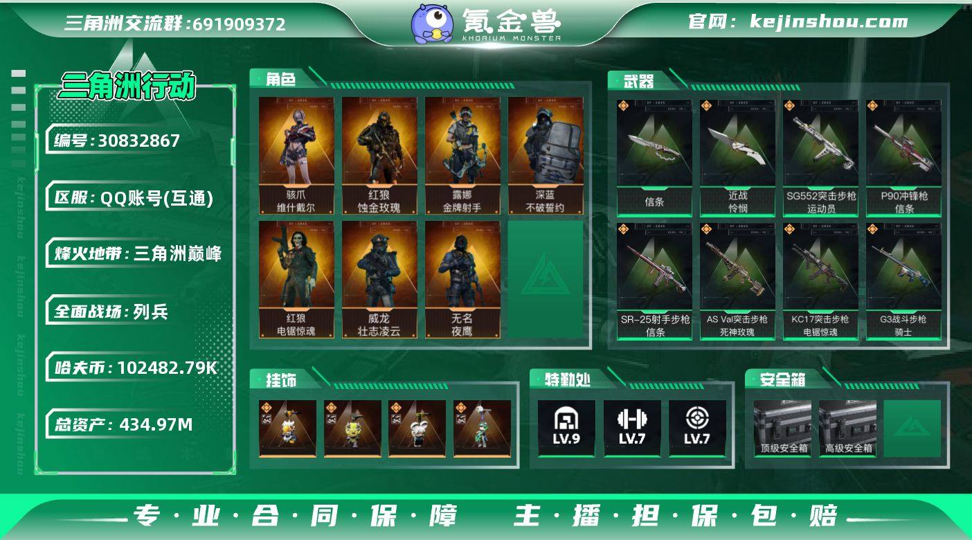 实名:可二次实名 总资产:434.97M 哈夫币:102482.79K S7顶级安全箱(3x3),S7高级安全箱(2x3) 烽火地带段位:三角洲巅峰 烽火地带等级:60 全面战场段位:列兵 全面战场等级:39 9级仓库,7级训练中心,7级靶场,1级潜水中心,1级收藏室