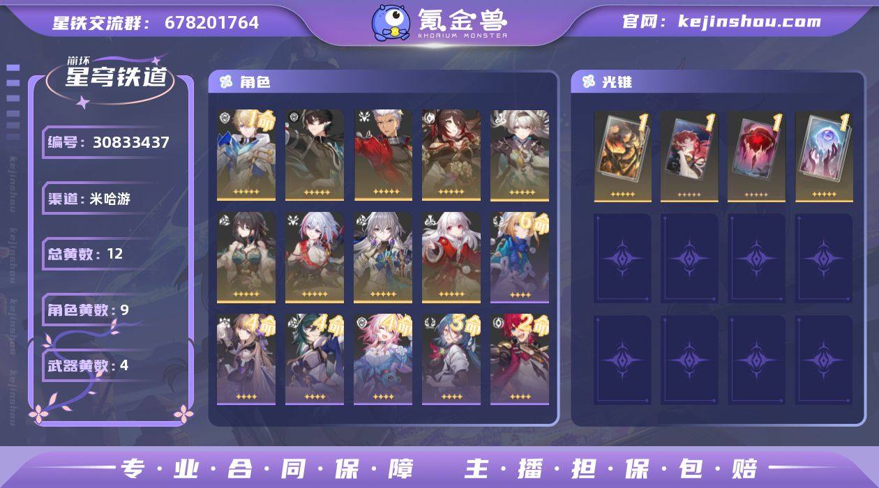 开拓等级:64 开拓者性别:女 总黄数:12 星轨专票:0 五星角色数:9 1命杰帕德,0命丹恒·腾荒,0命Archer,0命忘归人,0命流萤,0命阮·梅,0命托帕&账账,0命布洛妮娅,0命克拉拉 五星光锥数:4 1精理想燃烧的地狱,1精银河铁道之夜,1精记一位星神的陨落,1精记忆永不落幕 邮箱状态:未绑定 卖家说:急回血,🉑小刀,不可退换,事妈别来