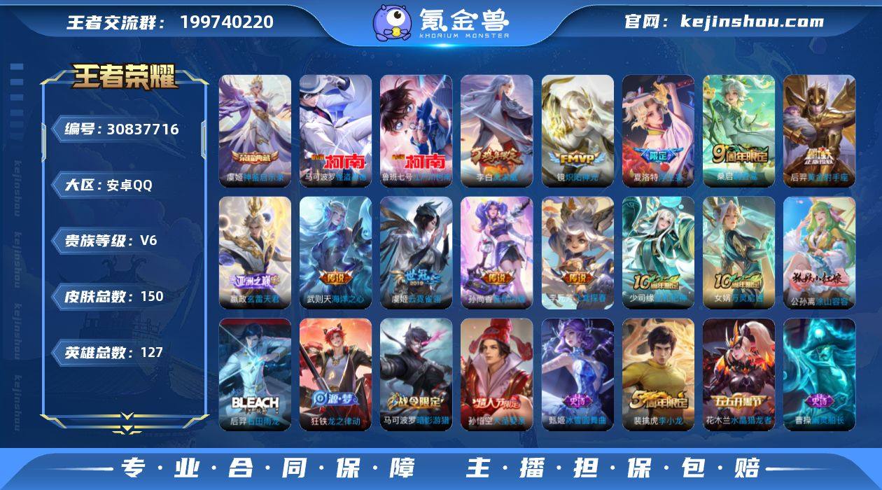 【王者荣耀】珍品无双0 典藏1 无双0 珍品传说2 传说11 史诗30 英雄127 皮肤150 贵族6级 荣耀典藏:神鉴启示录__珍品传说:江户川柯南|怪盗基德__传说皮肤:鸣野蒿|音你闪耀|炽阳神光|海洋之心|云霓雀翎|黄金射手座|飞鸢探春|浮生妄|凤求凰|玄雷天君|神树通天__稀有限定:大圣娶亲|李小龙|暗影游猎|海滩派对|皇家上将|混沌棋|黎明之约|魔术师|驱傩正仪|沙漠行僧|朔风刀|醍醐杖|天狼溯光者|万华元夜|演武夺筹|疑决卦|阴阳师|御旌|御銮|御狮|原初追逐者|暗隐猎兽者|白蛇|冰冠公主|冰雪圆舞曲|地狱岩魂|黄金分割率|魅力维加斯|圣诞狂欢|水晶猎龙者|鹰眼统帅|幽灵船长|逐浪之夏|噬灭天穹|心灵战警|谧流熔炉|万物之道|烛龙|原初探秘者|苍威无极|刘禅-鸭鸭历险记|沈梦溪-鸭鸭历险记|龙之律动|虚灵犬护|石田雨龙|逆浪荇歌|孙策-百相守梦|周瑜-百相守梦|黄忠-百相守梦|涂山容容|万灵启世|巫礼祀神|鹤鸣心笺|周瑜-线条小狗__优质皮肤:尼罗河女神|创世神祝|埃及法老|孤猎|午夜歌剧院|海之征途|碧珀绯影|森|维京掠夺者|绯红之刃|启蛰|生化警戒|街头旋风|绝影神枪|赤焰之缨|福禄兄弟|前尘|精灵王|剑舞者|龙域领主|花间舞|蔷薇王座|圣殿之光|异域舞娘|精灵公主|万圣前夜|功夫炙烤|秘密基地|次元突破|奇妙博物学|守护之力|坚韧之力|功夫老勺|命运角斗场|幻想奇妙夜|海滩丽影|阿尔法小队|兔女郎|死亡骑士|黄金武士|少女阿狸|天使之翼|宫本武藏-未来纪元|街头霸王|教廷特使|重装意志|白色死神|程咬金-星际陆战队|大发明家|哥特玫瑰|魅影绮裳|西施-雪境奇遇|猪八戒-西部大镖客|缤纷绘卷|掌控之力|雾都夜雨|逐霄战戟|铁骨偃魂|霸王丸|敏锐之力|西施-归虚梦演|乓乓大师|五福同心|盾山-圆桌骑士|曜-归虚梦演|太乙真人-圆桌骑士|沉稳之力|化身博士|花好人间|万象初新|苍林狼骑|劲辣红锅|命运加冕|小满鸭|死霸装|无双福将|锦麟游梦|踏浪烽翎|...